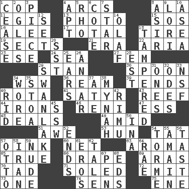 ACROSS 1. Police officer (slang) 4. Curves 8. Chicken ___ king 11. Armor plate that protects the chest 13. Picture 15. Distress signal 16. Toward shelter 17. Add up to 18. Hoop that covers a wheel 19. Religious groups 21. Period 22. Operatic vocal solo 23. Compass dir. 24. Ocean 27. Opposite of masc. 29. Comedian Laurel of Laurel & Hardy 30. Soup utensil 34. Compass dir. 36. 480, 500 or 516 sheets of paper 39. Looks after 40. Roll call or roster of names 41. Letch 43. Coral ridge 44. Removes the wrinkles 46. Painter Guido (1575-1642) 47. Double-curved letter 48. Allots cards 49. Among 51. Deep reverence 53. Attila the _ 54. Make lace 57. Pig sound 60. Fish or hair follower 63. Odor 65. Loyal 66. Window treatment 69. Caspian sea tributary 70. Small boy 71. Having a sole or soles 72. Give off 73. Single 74. Elected reps. 75. Compass dir. DOWN 1. Stop 2. Stares at amorously 3. Component 4. Fitting 5. 17th letter of the Greek alphabet 6. ____ d'Azur (French Riviera) 7. Play the lead 8. SW Saudi Arabia district 9. Australian parrot (variant) 10. Toward the sea 12. Arrange properly for use 14. Norwegian king 18. ________ with (broke a safety seal) 20. Fast jet (abbr.) 25. Hearing organs 26. Approach 28. Eastern Standard Time (abbr.) 29. Tchaikovsky ballet 31. Washington bills 32. Lyric poems 33. Overdraft (abbr.) 34. Had on 35. Portico 37. Had dinner 38. Non-adult bird? 40. To free from 42. Tall New Zealand timber tree 45. Compass dir. 50. _ tizzy (2 wds.) 52. Conclusions 54. Singer Mel 55. At full speed 56. Clothes sense 57. Von Bismarck 58. SW Asia republic 59. Naked 61. Greek god of love 62. Falsehood 64. Actress Charlotte 67. Fenced enclosure 68. Begley and Asner