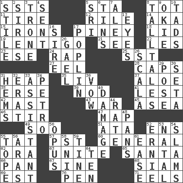 ACROSS 1. Fast planes 5. R.R. building 8. Small child 11. Become fatigued 12. Cause heat under the collar 14. Alias (abbr.) 15. Metal shackles 17. Abounding in pines 18. Hat (slang) 19. Small, flat, pigmented spot on the skin 21. Perceive with the eye 22. French article 23. Compass dir. 24. Hit sharply and swiftly 25. Fast jet (abbr.) 27. Snakelike fish 28. Balmoral and tarboosh 31. Pile 35. 54 in ancient Rome 37. _ vera 38. Celtic language 39. Allow head to fall sleepily 41. For fear that 42. Vertical spar for supporting sails 43. Armed conflict 45. Toward the sea 46. Use a spoon 47. Atlas unit 49. "Barney Miller" actor Jack 51. "One Day ___ Time" 52. Followers of ems 55. Make lace 57. Pacific Standard Time (abbr.) 60. Commissioned military rank 62. Mouth or opening 63. Join together 65. Before Barbara or Clara 66. Baking dish 67. Trig term 68. Thailand, formerly 69. Eastern Standard Time (abbr.) 70. Writing instrument 71. Snakelike fish DOWN 1. Vertical member of a panel or frame 2. Titles for men of rank and authority 3. Heavy duty weighing machine 4. Transmitted 5. Indian title of respect (Mr.) 6. Airtight sealed metal containers 7. Toward shelter 8. Baron Munchausen's specialties 9. Migrant worker of the '30s 10. Small boys 13. Sight organs 16. Male parent of an animal 17. Cotton for raincoats, e.g. 20. Highlander 26. Any of the three canals of the cochlea 29. Introduce or present, as a question 30. Bristle 31. Cloth borders 32. Part of Q.E.F. 33. Helper 34. Stone: prefix 36. Promise 40. Break 44. Pace 48. Baking dishes 50. Musical composition 52. Bert's buddy 53. Brizilian seaport 54. Criticizes harshly 55. Drink excessively 56. Ancient river in northeast Turkey 58. Clip 59. Prong on a fork 61. Relaxation 64. "___ Little Indians"