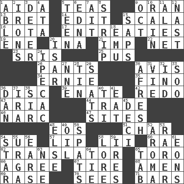 ACROSS 1. Opera by Verdi 5. Afternoon social gatherings 9. NW Algerian seaport 13. Cy Young winner Saberhagen 14. Prepare for publication 15. Any of the three canals of the cochlea 16. Globular water bottle used in Asia 17. Pleas 19. Compass dir. 20. _ tizzy (2 wds.) 21. Naughty child 22. Fish or hair follower 23. Indian titles of respect 25. Suppuration 26. Leg coverings 30. Advice 34. Bert's buddy 35. A pale, very dry sherry 36. Compact _ 39. Maternal 42. Redecorate 43. Roberta Peters solo 44. Swap 46. Drug cop 47. Settings 48. Greek goddess of the dawn 51. Burn to charcoal 54. Institute legal proceedings 57. Mouth edge 58. Cards in a Roman deck? 60. Actress Charlotte 62. Interpreter 65. "Corrida" creature 66. Match 67. Hoop that covers a wheel 68. So be it 69. To erase 70. Observes 71. Oblong pieces of solid material DOWN 1. Competent 2. Removes the wrinkles 3. Prevent from occurring 4. _ moment's notice (2 wds.) 5. Adolescent 6. Pulitzer Prize-winning author Ferber 7. Small island 8. Remove all contents or possession from 9. Sep. follower 10. Water falling in drops from the sky 11. Toward shelter 12. Political cartoonist Thomas 15. Plant excrements 18. Australian flightless bird 20. Austrian river, tributary to the Danube 24. Medicinal drug used to evoke vomiting 27. Compass dir. 28. Shallow baking pan 29. Theater features 30. Anew 31. Compete 32. Indiana (abbr.) 33. "Barney Miller" actor Jack 36. One of the 12 tribes of Israel 37. Lyricist Gershwin 38. Title for a knight 40. Three (prefix) 41. Ingest 45. Tenth: prefix 48. Otherwise 49. Petroleum 50. Arguments over trivial matters 52. Odor 53. Less widely known 54. Play the lead 55. Capital and largest city of Mongolia 56. Hearing organs 58. Old wives' tales, e.g. 59. Angers 61. Immeasurably long periods of time 63. Born 64. Standoff 65. Keyboard key
