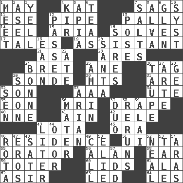 ACROSS 1. Can I? 4. Krazy ___ of comics 7. Droops 11. Compass dir. 12. Corncob 13. Chummy 14. Snakelike fish 15. Operatic vocal solo 16. Finds the solution 17. Falsehoods 19. Helper 21. White ___ sheet 23. Ancient Greek god of war 24. Cy Young winner Saberhagen 25. A saturated hydrocarbon 26. Label 29. Something which is sent 30. Mountains (abbr.) 31. "We ___ not amused" (Victoria) 32. Male offspring 33. Auto club (abbr.) 34. Shoshoni 35. Period of immesurable duration 36. Medical imaging device (abbr.) 37. Window treatment 40. Compass dir. 41. The 18th letter of the Arabic alphabet 42. Ubangi River tributary 43. Globular water bottle used in Asia 45. Mouth or opening 46. Dwelling 51. National forest in Provo, Utah 55. Speaker 56. ____ Jay Lerner 58. Ewer handle 59. Carrier 60. Flaplike coverings 61. According to 62. SW Saudi Arabia district 63. Directed 64. French article DOWN 1. Rendezvous 2. Toward the sea 3. Shout 4. Apertif with cassis 5. Capital of Western Samoa 6. Afternoon social gatherings 7. Table seasonings 8. Inventor's middle name 9. Small, secluded valley 10. System (abbr.) 12. Went by 13. Airs 16. Begets 18. Merit 20. Before Barbara or Clara 22. Had dinner 24. Child's nurse 25. With great haste 26. Grayish beige 27. Johnson of "Laugh-In" 28. Turn to the right 29. Within a short period 32. Elected rep. 33. Believer in; advocate of (suffix) 36. Mother 37. Superhero pair 38. Summer TV shows 39. Mountain range southwest of Kyrgyzstan 43. 61 cubic inches 44. Aroma 46. Roll call or roster of names 47. Greek god of love 48. Suttee (variant) 49. Give a ring to 50. Writer Wiesel 52. Actress Patricia 53. Story 54. Caspian sea tributary 57. Increase