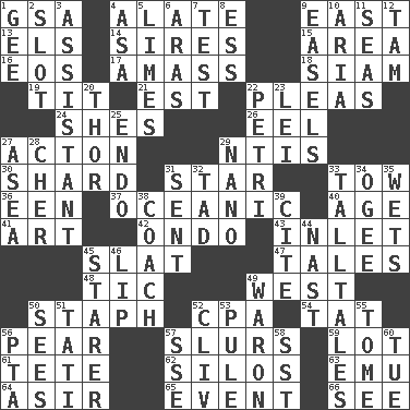 ACROSS 1. Girls' org. (abbr.) 4. Having winglike extensions 9. 90 degrees 13. Raised railways 14. Fathers 15. Length times width 16. Greek goddess of the dawn 17. Collect or gather 18. Thailand, formerly 19. Teat (slang) 21. Eastern Standard Time (abbr.) 22. Entreaties 24. "______ My Girl" (Turtles hit) 26. Snakelike fish 27. Gambison 29. Nuclear Threat Initiatives 30. Pottery fragment 31. Play the lead 33. Pull behind 36. Car or cant ending 37. Pertaining to the sea 40. Personal question 41. Tate display 42. Southwest Nigerian state 43. An arm off of a larger body of water 45. Narrow board 47. Lies 48. Nervous spasm 49. Compass direction 50. Staphylococcus 52. Numbers guy (abbr.) 54. Make lace 56. Lightbulb-shaped fruit 57. Disparaging remarks 59. Car dealer's back yard 61. Wig 62. Grain storage towers 63. Australian flightless bird 64. SW Saudi Arabia district 65. Happening 66. Observe DOWN 1. Turn to the right 2. Slit 3. Helper 4. White ___ sheet 5. Citrus fruits 6. Ancient river in northeast Turkey 7. Trial 8. Double-curved letter 9. Artist's stands 10. Operatic vocal solo 11. Oceans 12. Scottish cap 20. Son of Odin 22. _ dish (used to culture cells) 23. Flowery wreath 25. Inside; within (prefix) 27. Toward the sea 28. "Mermaids" star 29. Billionth: prefix 31. Posted 32. Bit 33. Baron Munchausen's specialties 34. Double curve, resembling the letter S 35. Moistens 38. Team commander 39. Quote 44. Political cartoonist Thomas 45. A viewer who gazes fixedly 46. Mouth edge 49. Make _____ (do battle with) 50. Observes 51. Jacques of French films 52. 154 in Roman numerals 53. Whine 55. Heavy book 56. Parent Teacher Assoc. 57. Compass dir. 58. Fast jet (abbr.) 60. Third day of the wk.