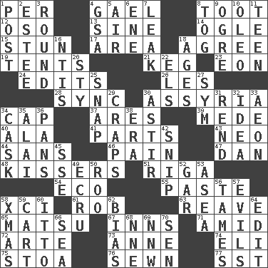 ACROSS 1. For each 4. Highlander 8. A blast of a horn 12. Bear (Spanish) 13. Trig term 14. Stare 15. Astound 17. Type of rug 18. Match 19. Portable shelters 21. Barrel 23. Age 24. Prepares for publication 26. French article 28. Synchronize (abbr.) 30. Nineveh was its capital 34. Head covering 37. Ancient Greek god of war 39. Ancient Persian 40. Wing 41. Pieces 43. Modern: prefix 44. Without 46. Ache 47. Daniel's nick name 48. Smoochers 51. Port city in Latvia 54. Environmental prefix 55. Thick mixture 58. One more than ninety 61. Director Reiner 63. Break or tear apart 65. Taiwanese island in East China Sea 67. Taverns 71. Among 72. Johnson of "Laugh-In" 73. Singer Murray 74. Connecticut Ivy Leaguer 75. Portico 76. Stitched 77. Fast jet (abbr.) DOWN 1. Mail 2. First name in cosmetics 3. One shot 4. Girls' org. (abbr.) 5. Wind 6. Compass dir. 7. Path through which fluid escapes 8. Coat; cloak 9. Legendary monster 10. Butter sub 11. Adolescent 16. Nuclear Threat Initiatives 18. Ripens 20. Filthy place 22. Raised railways 25. Fastener 27. Symbol (abbr.) 29. Dice game 30. Being in motion 31. Tear apart 32. It may be bright or harebrained 33. A really long time 34. Keg 35. Jai _ 36. Zero-star reviews 38. Epoch 42. Sever or remove by pinching or nipping 45. Compass dir. 49. Shade of tan 50. Friend of Pooh 52. Slender fish 53. At sea 56. Domesticates 57. Vices 58. Dec. holiday 59. Haul 60. "Tell ____ the Marines!" 62. Prejudice 64. Prepare for publication 66. Ocean 68. Compass dir. 69. Compass dir. 70. Elected rep.