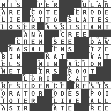 ACROSS 1. Mountains (abbr.) 4. For each 7. ____ Bator 11. "We ___ not amused" (Victoria) 12. ____ d'Azur (French Riviera) 13. Eat (away) 14. Whopper 15. Von Bismarck 16. Chalkboards 17. Failure 19. Aide 21. Santa ___, CA 23. Algonquian 24. Group working together 25. Observe 26. Obsolete 29. Rhinal 30. Followers of ems 31. Ending with capital 32. Storage container 33. Krazy ___ of comics 34. Large container 35. Raised railways 36. Acquire through effort 37. Gambison 40. Fish or hair follower 41. Big collection agency 42. Carrot, for example 43. Australian parrot (variant) 45. Domesticated feline 46. Dwelling 51. Musical pauses 55. Speaker 56. Lyric poems 58. Luau course 59. Carrier 60. Moving, as bait 61. 100% 62. SW Saudi Arabia district 63. Had dinner 64. To separate or throw off DOWN 1. Shopping center 2. Musical group of three 3. Perceives with the eye 4. Cooking vessel 5. Singer James 6. Vintage cars 7. A salt of uric acid 8. Globular water bottle used in Asia 9. An important port of Yemen 10. A home for chicks 12. Pupil covering 13. Otherwise 16. Begets 18. Hearing organs 20. Aroma 22. Leather borer 24. 2nd pers. sing. pres. of can (arch.) 25. Actors Connery and Penn 26. A piece of turf (Scot.) 27. Muslim summons to prayer 28. Soggy 29. The longest river in the world 32. Benjamin's nick name 33. Japanese brewing company 36. One who wires 37. Curve 38. Unrefined 39. Haul 43. 61 cubic inches 44. Scent 46. Round or rotation of duties 47. Greek god of love 48. Suttee (variant) 49. Root beer relative 50. Prepare for publication 52. Practice fight 53. Lacquered or enameled metalware 54. Filth; sediment 57. First lady