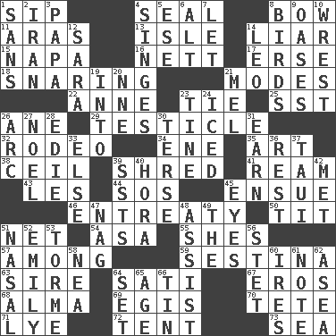 ACROSS 1. Small drink 4. Lick closed 8. Ribbon knot 11. Ancient river in northeast Turkey 13. Capri or Wight 14. One who doesn't tell the truth 15. California wine valley 16. Remaining after all deductions 17. Celtic language 18. Catching in a trap 21. Methods 22. Singer Murray 23. Make a knot 25. Fast jet (abbr.) 26. A saturated hydrocarbon 29. One of the two male reproductive glands 32. Cowboy competition 34. Compass dir. 35. Nonscientific branch of learning 38. To provide with a ceiling 39. Tear up 41. 480, 500 or 516 sheets of paper 43. French article 44. Mayday 45. Follow as a consequence or result 46. Plea 50. Teat (slang) 51. Fish or hair follower 54. White ___ sheet 55. "______ My Girl" (Turtles hit) 57. Amid 59. French poetic form 63. Title for a man of rank and authority 64. Suttee (variant) 67. Greek god of love 68. _ mater 69. The front part of a cuirass 70. Wig 71. Sodium hydroxide 72. Portable shelter 73. Ocean DOWN 1. Without 2. SW Asia republic 3. Dad 4. Scorches 5. Compass dir. 6. Keyboard modifier key 7. Allow 8. Avian creatures 9. Fertile tracts in a desert 10. Take or capture by force 12. "Two Mules for Sister ____" 14. Lion 19. To the inside or interior of 20. Compass dir. 21. Cartoonist voice _ Blanc 23. Prong on a fork 24. On the rocks 26. Curve 27. Christmas carol 28. Singer Brickell 30. Laconic 31. Merit 33. Otherwise 36. Take ten 37. "Change" in Tahitian 39. Fast planes 40. Israeli folk dance 42. Was introduced to 45. Snake ____ (dice throw) 47. Tired old horse 48. Help 49. Definite Article 51. Rhinal 52. Poet Dickinson 53. Singer Mel 56. Proofreading order 58. Teachers' org. 60. Angers 61. Make mention of 62. Toward the sea 64. Put into a specified state 65. Ripen 66. Shallow baking pan