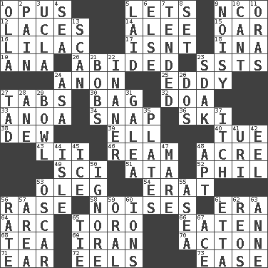 ACROSS 1. Musical composition 5. Allows 9. Non-commissioned officer (abbr.) 12. Shoestrings 14. Toward shelter 15. Rowing implement 16. Pale purple color 17. Is not 18. _ tizzy (2 wds.) 19. Santa ___, CA 20. Tolerated 23. Fast planes 24. Soon (poet.) 25. Whirlpool 27. Bar bills 30. Paper or plastic container 32. ___ good deed 33. Small Philippine buffalo 34. Fastener 36. What Jean-Claude Killy likes to do 38. Morning condensation 39. Pipe bend 40. Third day of the wk. 43. Cards in a Roman deck? 46. 480, 500 or 516 sheets of paper 48. 43,560 square feet 49. _-fi 51. _ moment's notice (2 wds.) 52. Silvers or Donahue 53. Cassini of fashion 54. Part of Q.E.F. 56. To erase 58. Annoying sounds 61. Epoch 64. Curve 65. "Corrida" creature 66. Ingested 68. Beverage made from leaves 69. SW Asia republic 70. Gambison 71. Ewer handle 72. Snakelike fish 73. Comfort DOWN 1. Water jar 2. Ache 3. Southern CA. univ. 4. Ocean 5. Put down 6. Otherwise 7. Looked after 8. Put into a specified state 9. Annoyingly loud 10. Patter 11. Mouths or openings 13. Glance over 21. Moves up and down 22. More lacking in sense or substance 23. Neighbor of Neb. 24. White ___ sheet 26. Two (Sp.) 27. Small boy 28. One (Scot) 29. Soup holder 31. An organ shaped like a helmet 35. Food holders 37. Hankering 41. RI univ. 42. Snakelike fish 44. Capri or Wight 45. Frozen water 47. Female horse 48. Fitting 50. Dismiss 53. Motion picture award 55. Toward the sea 56. Assign a rank or rating to 57. Type of rug 59. Spoken 60. Charged particles 61. Singer James 62. Vintage cars 63. Queen of England 1702-14 65. Standoff 67. Adept person