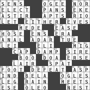 ACROSS 1. Elected reps. 5. Double curve, resembling the letter S 9. And not 12. Opt 14. Zero-star reviews 15. Supplement with great effort 16. Having gotten out of bed 17. Flats, for short 18. _ de Janeiro 19. Allow 20. One or the other 23. Nights before holidays 24. Ancient Persian 25. Relaxation 27. Stockings 30. Followers of ems 32. Period 33. Of or related to the anus 34. The sixth month of the Jewish calendar 36. Third day of the wk. 38. Flowery wreath 39. Biblical high priest 40. Russian fighter aircraft 43. Head covering 46. Moist 48. Father 49. Sometimes accompanies a hiss 51. ___ good deed 52. Celtic language 53. Den 54. Petty quarrel 56. One third of a yard 58. Outscore 61. Viper 64. Working for oneself (abbr.) 65. Actor Lugosi 66. Stares at amorously 68. Part of a journey 69. Precipitation 70. Confronts 71. Compass dir. 72. Butter sub 73. Egg locale DOWN 1. Lick closed 2. Otherwise 3. Remaining after all deductions 4. _-fi 5. Brightly colored fish 6. Open wide 7. Main course 8. Curvy letter 9. Boldness 10. Migrant worker of the '30s 11. Vintage cars 13. Relationship diagram 21. It may be bright or harebrained 22. Looked after 23. He sold his birthright 24. Cartoonist voice _ Blanc 26. Nonscientific branch of learning 27. Actor Linden 28. Single 29. Ketch in the Levant 31. Vegetable dish 35. Full of chinks, cracks, or crevices 37. Independent ruler or chieftain 41. Big collection agency 42. Unit of force equal to gravity 44. Blind as ____ 45. Luau course 47. Dad 48. Arrange properly for use 50. Severe or trying experience 53. Inn 55. Smallest unit of an element 56. Do some clerical work 57. Washington bills 59. Writer Wiesel 60. Papal veil 61. Toward shelter 62. Puts into a specified state 63. Inconspicuous attention getter 65. Sis' sibling 67. Commissioned military rank (abbr.)