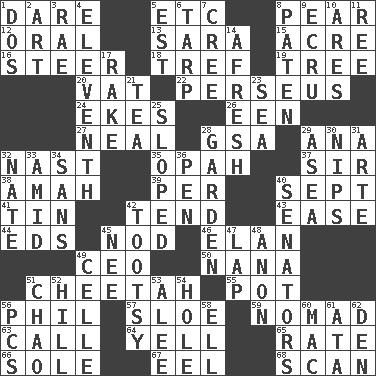 ACROSS 1. Have the gumption 5. And so on (abbr.) 8. Lightbulb-shaped fruit 12. Relating to the mouth 13. "Two Mules for Sister ____" 15. 43,560 square feet 16. Navigate 18. Unclean, religiously 19. Family _ (genealogy) 20. Large container 22. Son of Zeus who helped slay Medusa 24. Makes supply last 26. Car or cant ending 27. Actress Patricia 28. Girls' org. (abbr.) 29. Santa ___, CA 32. Political cartoonist Thomas 35. Brightly colored fish 37. Title for a knight 38. Nursemaid 39. For each 40. Back-to-school mo. 41. Metal container 42. Watch over 43. Comfort 44. Begley and Asner 45. Dreamland 46. Flair 49. Corporate head (abbr.) 50. Nanny 51. Leopard's kin 55. Cooking vessel 56. Silvers or Donahue 57. A type of plum 59. Wanderer 63. Give a ring to 64. Shout 65. Pace 66. Not divided or shared with others 67. Snakelike fish 68. Examine hastily DOWN 1. Two (Sp.) 2. Tate display 3. Actress Charlotte 4. Veterans Day date 5. Eastern Standard Time (abbr.) 6. Canvas cover 7. Algonquian 8. Eucharist need 9. Shade of tan 10. Ancient Greek god of war 11. Portuguese money of account (variant) 14. Anew 17. Libertine 21. Beverage made from leaves 23. Ocean 25. Inclined 28. Place where plants grow 29. Toward the sea 30. Cuts off 31. Johnson of "Laugh-In" 32. Nathan's nickname 33. Among 34. Without 36. Writing instrument 40. Legislators 42. A girl or young woman (variant) 45. Born 47. Infant locale 48. Soon (poet.) 49. Cell (Danish) 51. US Secretary of Labor Elaine L. _ 52. Land elevation 53. Toward shelter 54. Hollow 56. Personal Computers (abbr.) 58. Pipe bend 60. Apple computer (short form) 61. "One Day ___ Time" 62. Lair