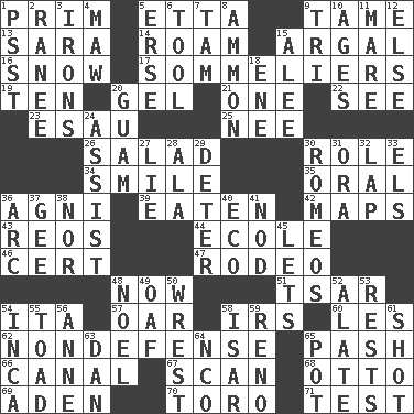 ACROSS 1. Demure 5. Singer James 9. Not wild 13. "Two Mules for Sister ____" 14. Wander aimlessly 15. Therefore, facetiously 16. Frozen precipitation 17. Wine waiters 19. Nine, plus one 20. Set 21. Single 22. Observe 23. Son of Isaac 25. Born 26. First course 30. Hero or heavy, e.g. 34. Grin 35. Taken by mouth 36. Hindu god of fire 39. Consumed 42. Atlas contents 43. Vintage cars 44. Learning spot: Fr. 46. Foregone conclusion 47. Cowboy competition 48. At this time 51. Russian ruler of old 54. Call ___ day 57. Rowing implement 58. Big collection agency 60. French article 62. Unrelated to defense, as in spending 65. Romantic infatuation 66. Lessep's creation 67. Examine hastily 68. "Beetle Bailey" pooch 69. An important port of Yemen 70. "Corrida" creature 71. Trial DOWN 1. Inconspicuous attention getter 2. Indian princess (variant) 3. Metal shackles 4. Informal term for the mouth 5. Celtic language 6. Utensil 7. Scottish cap 8. ID or VA city 9. Three (prefix) 10. Ripens 11. Female horse 12. Otherwise 15. Toward shelter 18. Compass dir. 20. Island territory of the United States 24. Aid 27. Whopper 28. In the manner of 29. Prevent from occurring 30. Lover boys 31. Mouth or opening 32. Infant locale 33. Raised railways 36. Curve 37. Unit of force equal to gravity 38. And not 40. Environmental prefix 41. Dreamland 45. Allows 48. Christmas carol 49. Clumsy lout 50. Take or capture by force 52. Having winglike extensions 53. Musical pauses 54. South American Indian 55. Frog relative 56. Queen of England 1702-14 58. Austrian river, tributary to the Danube 59. Western Nevada city 61. Opportunity 63. Daniel's nick name 64. Non-commissioned officer (abbr.) 65. Cooking vessel