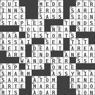 ACROSS 1. Fr. "Yes" 4. Ancient Persian 8. For each 11. Restaurants 13. Greek god of love 14. Indian skirt 15. Louse (plural) 16. Backtalk 17. The Jewish people; Israel 18. Paper fasteners 21. Looks after 22. Lacquered or enameled metalware 23. Teachers' org. 25. Perceive with the eye 26. Sound made by sheep 29. What propaganda does 32. Slender Brazilian palm 34. Ocean 35. Teat (slang) 38. It's straight from the horse's mouth 39. Started a card game 41. Type of rug 43. "We ___ not amused" (Victoria) 44. Conclude 45. Approach 46. Nomad 50. Fast jet (abbr.) 51. Cleo's killer 54. ___ a Wonderful Life 55. At one time in the past 57. Excessive but superficial compliments 59. Nineveh was its capital 63. "Two Mules for Sister ____" 64. Tiny particle 67. French philosopher Descartes 68. Johnson of "Laugh-In" 69. Female horse 70. Inside; within (prefix) 71. Mountains (abbr.) 72. The sixth month of the Jewish calendar 73. Electrically charged atom DOWN 1. Petroleums 2. A single undivided whole 3. South American Indian 4. Makes clutter 5. Epoch 6. Two (Sp.) 7. Double-curved letter 8. Aches 9. Eat (away) 10. Wash lightly 12. Back-to-school mo. 14. Compass dir. 19. Farming town in central California 20. Biblical high priest 21. Make lace 23. Christmas carol 24. Part of Q.E.F. 26. Tavern 27. Toward the sea 28. SW Saudi Arabia district 30. Sadhe (variant) 31. Comedian Laurel of Laurel & Hardy 33. Afresh 36. Angers 37. Afternoon social gatherings 39. Gouge 40. Extremities 42. Nonscientific branch of learning 45. Curves 47. Direct toward a target or goal 48. Wanderer 49. Followers of ems 51. Indian state 52. Don Adams' spy role 53. Components 56. Jane of fiction 58. Actress Charlotte 60. Painter Guido (1575-1642) 61. Southeast Asian peninsula 62. Age 64. Wet nurse (var.) 65. Bit 66. Mouth or opening