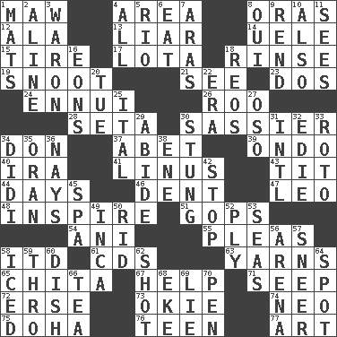 ACROSS 1. Informal term for the mouth 4. Type of rug 8. Mouths or openings 12. Chicken ___ king 13. One who doesn't tell the truth 14. Ubangi River tributary 15. Become fatigued 17. Globular water bottle used in Asia 18. Wash lightly 19. Snout, nose 21. Perceive with the eye 23. Two (Sp.) 24. World-weariness 26. Friend of Pooh 28. Bristle 30. More lively and spirited 34. Spanish title 37. Collude with 39. Southwest Nigerian state 40. Lyricist Gershwin 41. "_ and Lucy" (Charlie Brown theme song) 43. Teat (slang) 44. 24-hour periods 46. Gouge 47. Lion 48. Heighten or intensify 51. Republicans 54. Cuckoo 55. Entreaties 58. It would 61. Music discs 63. Tall tales 65. Riviera of "Kiss of the Spider Woman" 67. Assist 71. Ooze 72. Celtic language 73. Migrant worker of the '30s 74. Modern: prefix 75. Capital of the state of Qatar 76. Adolescent 77. Nonscientific branch of learning DOWN 1. Floor coverings 2. Place in a line 3. Make _____ (do battle with) 4. 100% 5. _ de Janeiro 6. Erode 7. Caspian sea tributary 8. Fr. "Yes" 9. Tear apart 10. In addition 11. Perceives with the eye 16. Immeasurably long periods of time 18. Vintage cars 20. Third day of the wk. 22. Period 25. Slanted text style (abbr.) 27. Bear (Spanish) 29. Stay 30. Feeling sharp psychological pain 31. International (abbr.) 32. Singer Brickell 33. Printing process, for short 34. "You Light Up My Life" star Conn 35. NW Algerian seaport 36. Negative votes 38. Compass dir. 42. Constrict 45. Health resort 49. South American Indian 50. To free from 52. Apply oneself diligently 53. Oceans 56. Sports stadium 57. Scornful expression 58. On the rocks 59. Through, poetically 60. Food container 62. Attempt 64. Blemish 66. Afternoon social gathering 68. Supplement with great effort 69. Untruth 70. Writing instrument