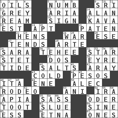 ACROSS 1. Petroleums 5. Unfeeling 9. _ Lanka 12. Jennifer or Joel 13. Roberta Peters solo 14. Actor Alda or Thicke 15. 480, 500 or 516 sheets of paper 16. Attach a signature 17. Polynesian shrub of the pepper family 18. Eastern Standard Time (abbr.) 19. Fitting 21. Eucharist need 22. Coop moms 24. Armed conflict 26. Compass dir. 27. Watches over 28. Johnson of "Laugh-In" 29. "Two Mules for Sister ____" 30. Giggle 32. Play the lead 36. Proofreading order 37. Two (Sp.) 38. Jane of fiction 39. Event that recurs at intervals 40. Table seasonings 42. Like ___ of sunshine 43. Having a low temperature 44. Mexican monetary units 46. Call ___ day 49. Compass dir. 50. Actor Baldwin 51. Cowboy competition 53. Cuckoo 54. Retirement account (abbr.) 57. Capital of Western Samoa 58. Backtalk 61. Baltic tributary 62. A blast of a horn 63. Turn sharply 64. Trig term 65. Double-curved letter 66. Inactive volcano in Sicily 67. Washington bills DOWN 1. Legendary monster 2. Angers 3. Tough but pliablecoriaceous 4. Symbol (abbr.) 5. Political cartoonist Thomas 6. RI univ. 7. Russian fighter aircraft 8. Bar 9. Schedule 10. All-night dance parties 11. Silly 14. Alias (abbr.) 19. Also 20. Inconspicuous attention getter 21. Before (prefix) 23. Related on the mother's side 24. Take or capture by force 25. Had dinner 27. Jacques of French films 28. Hold, grip (Informal) 29. Fast jet (abbr.) 31. Peak District village in England 32. Gospel singer Marvin 33. Polypeptide antibiotic 34. Ancient river in northeast Turkey 35. Marina Del _, California 40. Male child 41. Connect, as a bridge 43. Corporate head (abbr.) 45. Connecticut Ivy Leaguer 46. Feeling or showing extreme anger 47. Traditional theme or motif 48. Goodbye (Sp.) 52. Erode 53. Toward the sea 55. French philosopher Descartes 56. Ancient Greek god of war 58. Compass dir. 59. The first octave above the treble staff 60. Player for Phoenix 61. Bear (Spanish)