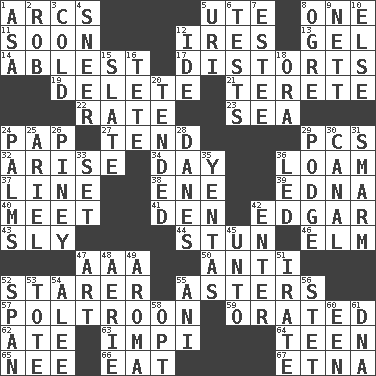 ACROSS 1. Curves 5. Shoshoni 8. Single 11. Within a short period 12. Angers 13. Set 14. Most capable 17. What propaganda does 19. Erase 21. Cigar-shaped 22. Pace 23. Ocean 24. Infant food 27. Be inclined (to) 29. Personal Computers (abbr.) 32. Ascend 34. 24 hours 36. Rich soil 37. Actor's bit 38. Compass dir. 39. Pulitzer Prize-winning author Ferber 40. Confront 41. Lair 42. _ Allan Poe 43. Mischievous 44. Surprise greatly 46. Shade tree 47. Auto club (abbr.) 50. Against 52. A viewer who gazes fixedly 55. Michaelmas daisies 57. Coward 59. Declaimed 62. Had dinner 63. Body of Kaffir warriors 64. Adolescent 65. Born 66. Erode 67. Inactive volcano in Sicily DOWN 1. White ___ sheet 2. Director Reiner 3. Chilled 4. Scornful expression 5. RI univ. 6. Trials 7. First name in cosmetics 8. Legendary monster 9. Remaining after all deductions 10. Otherwise 12. Binary compound 15. Schedule 16. False hair 18. Mouth or opening 20. Looked after 24. Insides of hands 25. Satellite of Uranus 26. Abounding in pines 28. Natives or inhabitants of Denmark 29. Porridge 30. Lessep's creation 31. Excessive but superficial compliments 33. Arrange properly for use 35. Gossips 36. Directed 42. Keyboard key 45. To (old English) 47. Tate display 48. Nest on high 49. Odor 51. Feeling or showing extreme anger 52. Connect, as a bridge 53. Carryall 54. Toward shelter 55. Cuckoo 56. Proofreading order 58. Elect 60. Car or cant ending 61. Heredity factor (abbr.)