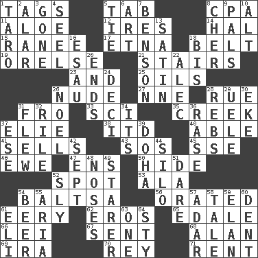 ACROSS 1. Labels 5. Bar bill 8. Accounting whiz (abbr.) 11. _ vera 12. Angers 14. Actor Linden 15. Indian princess (variant) 17. Inactive volcano in Sicily 18. Waist strap 19. Threatening words 21. Flight of steps 23. Added to 25. Lubricates 26. Unadorned 27. Compass dir. 28. Regret 31. Back 33. _-fi 35. Small stream 37. Writer Wiesel 38. It would 40. Competent 41. Exchanges for money 43. Distress signal 45. Compass dir. 46. She-sheep 47. Followers of ems 50. Flintstone garb 52. Specific locale 53. According to 54. Greek mezzo-soprano Agnes 56. Declaimed 61. Suggestive of the supernatural 62. Greek god of love 65. Peak District village in England 66. Luau accessory 67. Emitted 68. ____ Jay Lerner 69. Lyricist Gershwin 70. Marina Del _, California 71. Monthly bill DOWN 1. Pacific island yam 2. Having or resembling wings 3. Went 4. Sew up the eyelids of hawks and falcons 5. Make a knot 6. Tate display 7. Gillaume's butler role 8. "Mermaids" star 9. Friends 10. The first octave above the treble staff 13. Smooth fabric 16. He sold his birthright 18. Altar cloth linen 20. Extremities 22. Actor Baldwin 24. Tenth: prefix 26. Christmas carol 28. Confederate soldiers (slang) 29. Ubangi River tributary 30. Make supply last 31. Soared 32. Cause heat under the collar 34. It is 36. To erase 37. Compass dir. 39. Capital of the state of Qatar 42. Back-to-school mo. 44. Grain storage tower 48. Olfactory organs 49. A viewer who gazes fixedly 51. Have the gumption 52. Playfully artful 54. Fermented drink made from hops 55. Roberta Peters solo 57. The sixth month of the Jewish calendar 58. Falsehood 59. Style 60. Scratch 61. Connecticut Ivy Leaguer 63. Single 64. Filthy place
