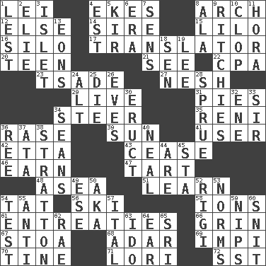 ACROSS 1. Luau accessory 4. Supplements with great effort 8. Bowlike part 12. Otherwise 14. The founder of a family 15. _ and Stitch 16. Grain storage tower 17. Interpreter 20. Adolescent 21. Observe 22. Numbers guy (abbr.) 23. Sadhe (variant) 27. Soft 29. Moving, as bait 31. Sliced desserts 34. Navigate 35. Painter Guido (1575-1642) 36. Raze (variant) 39. Player for Phoenix 41. One who makes use of a thing 42. Singer James 43. Stop 46. Merit 47. Small pie 48. Toward the sea 51. Memorize 54. Make lace 56. What Jean-Claude Killy likes to do 58. Charged atoms 61. Pleas 66. Broad smile 67. Portico 68. The sixth month of the Jewish calendar 69. Body of Kaffir warriors 70. Prong on a fork 71. Australian parrot (variant) 72. Fast jet (abbr.) DOWN 1. For fear that 2. Writer Wiesel 3. Small island 4. Eastern Standard Time (abbr.) 5. Apertif with cassis 6. Epoch 7. Elected reps. 8. Chicken ___ king 9. Actors Guy, Robert Welles, and Clint 10. Hoof sound 11. Israeli folk dance 13. Immeasurably long periods of time 18. Elected rep. 19. Area sheltered from the wind 24. The first octave above the treble staff 25. Expire 26. Nights before holidays 28. Upset 30. Spew [out] 32. Compass dir. 33. Title for a knight 34. Seines 36. To sift 37. _ moment's notice (2 wds.) 38. Ski resort town in Vermont 40. Be tempered by heat 44. "We ___ not amused" (Victoria) 45. R.R. building 49. Compass dir. 50. Alias (abbr.) 52. Swiss mountan, "Queen of the Mountains" 53. Typical standards 54. Trial 55. Against 57. Slanted text style (abbr.) 59. Cuts off 60. In a ____ (agitated or irritated) 62. Actress Charlotte 63. Wedding promise 64. Hearing organ 65. Indian title of respect (Mr.)