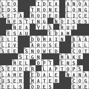ACROSS 1. Lion 4. The content of cognition 8. Small Philippine buffalo 12. Begley and Asner 13. Heavy duty weighing machine 14. Yearn 15. Bristle 17. Cowboy competition 18. Louse (plural) 19. Inhabiting a nest 21. Annoying sounds 23. Teachers' org. 24. It is so 26. Regret 27. He sold his birthright 28. Dutch treat 30. Connecticut Ivy Leaguer 31. Realm 34. Sound made by sheep 37. 54 in ancient Rome 38. Came up 39. 100% 40. Perceive with the eye 41. Overwhelmed 42. Small bed 43. Signal 44. Cause to be 46. Cartoonist voice _ Blanc 47. Choose 50. Followers of ems 51. Sowing specialist 54. Portable computers 57. Unable to walk 58. Peak District village in England 60. Grandmother 62. One who uses or employs something 63. Mother 64. Gear tooth 65. Snakelike fish 66. Lyric poems 67. She-sheep DOWN 1. French article 2. Genesis locale 3. Clearly or manifestly demonstrative 4. Literary sarcasm 5. Evade 6. Compass dir. 7. Period of immesurable duration 8. Plant genus of onion and garlic 9. Annoying sound 10. At one time in the past 11. Eras 13. Three (prefix) 16. Toward the sea 20. The 19th letter of the Greek alphabet 22. NW Algerian seaport 25. Gospel singer Marvin 27. Writer Wiesel 29. Passed on 30. Raised railways 31. Mild oath, euphamism for damn 32. U. of Maine site 33. Cut the grass 34. Keyboard key 35. Medicinal plant 36. The first octave above the treble staff 41. Filth; sediment 43. Spring feasts 44. Was introduced to 45. Soon (poet.) 46. Klaipeda city 48. Food holder 49. Stories 51. Change direction abruptly 52. Comfort 53. San ____ (Riviera town) 55. For each 56. Frozen precipitation 59. Male parent 61. Mature