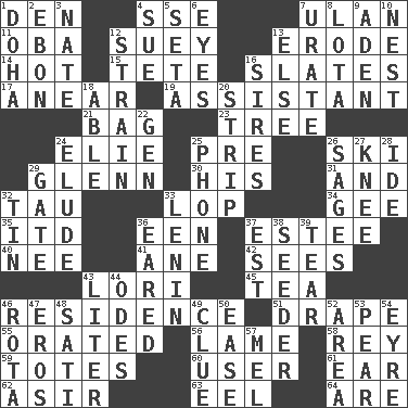 ACROSS 1. Lair 4. Compass dir. 7. ____ Bator 11. Chief or king in Benin or Nigeria 12. Chop _ 13. Eat (away) 14. Being at a high temperature 15. False hair 16. Chalkboards 17. Approach 19. Aide 21. Container for groceries 23. Family _ (genealogy) 24. Writer Wiesel 25. Before (prefix) 26. What Jean-Claude Killy likes to do 29. American astronaut and politician John 30. Part of HMS, perhaps 31. Added to 32. The 19th letter of the Greek alphabet 33. Trim (branches) 34. Unit of force equal to gravity 35. It would 36. Car or cant ending 37. First name in cosmetics 40. Born 41. A saturated hydrocarbon 42. Observes 43. Australian parrot (variant) 45. Beverage made from leaves 46. Dwelling 51. Window treatment 55. Spoke pompously 56. Unable to walk 58. Marina Del _, California 59. Lugs 60. One who makes use of a thing 61. Hearing organ 62. SW Saudi Arabia district 63. Snakelike fish 64. "We ___ not amused" (Victoria) DOWN 1. Capital of the state of Qatar 2. Inky black, to poets 3. Nathan's nickname 4. Take to court 5. Stalk of a moss capsule 6. Sight organs 7. A salt of uric acid 8. Globular water bottle used in Asia 9. Arabian gulf 10. A home for chicks 12. Put through a sieve 13. Otherwise 16. Fathers 18. Competent 20. Remove all contents or possession from 22. Commissioned mil. rank 24. Dodge 25. Give a jingle 26. Gurus 27. Leg joint 28. Binary compound 29. Yard entry 32. Metal container 33. Soviet premier 1918-24 36. Having ears or earlike features 37. Eastern Standard Time (abbr.) 38. Sowing specialist 39. Rend 43. 61 cubic inches 44. Lyric poems 46. Round or rotation of duties 47. Greek god of love 48. Suttee (variant) 49. A slight indication 50. Comfort 52. Length times width 53. Lightbulb-shaped fruit 54. Jane of fiction 57. Cartoonist voice _ Blanc
