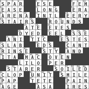ACROSS 1. Coast Guard woman 5. Compass dir. 8. Opposite of masc. 11. Comfort 12. Protracted 14. Period 15. Sports stadium 17. International (abbr.) 18. Suggestive of the supernatural 19. Flight of steps 21. Periods in a boxing match 23. Had dinner 25. Nights before holidays 26. Colored 27. Snakelike fish 28. Compass dir. 31. Cuckoo 33. Nervous spasm 35. _____ Park, CO 37. Broad, flat, thick piece 38. Begley and Asner 40. Patter 41. Remove soap 43. Filthy place 45. Added to 46. Call ___ day 47. Big _ 50. Baking chamber 52. _ and Stitch 53. For each 54. A viewer who gazes fixedly 56. Dirtied 61. Hoof sound 62. A single undivided whole 65. Grin 66. Infant food 67. Wig 68. Ache 69. Grow older 70. White ___ sheet 71. Angers DOWN 1. Oceans 2. Piece 3. Toward the sea 4. Painter Guido (1575-1642) 5. Connecticut Ivy Leaguer 6. Manchild 7. Main course 8. Nourish 9. Blunders 10. Can I? 13. Michael Jackson trademark 16. Like ___ of sunshine 18. Followers of ems 20. Proofreading order 22. Ubangi River tributary 24. Singer Brickell 26. Claim 28. Comedian Laurel of Laurel & Hardy 29. Transmit 30. Eastern Standard Time (abbr.) 31. Came down and settled, as after flight 32. Nanny 34. Music discs 36. Examine hastily 37. _ Lanka 39. Obstruct or block passage 42. Arab leader 44. Jacques Cousteau's middle name 48. Native American of Southwest Alaska 49. Pupil covering 51. Greek god of love 52. Pet locale 54. Volcanic refuse 55. Drink excessively 57. Body of Kaffir warriors 58. One who doesn't tell the truth 59. Writer Wiesel 60. Hiding places for outlaws 61. Tax preparer (abbr.) 63. It is 64. Beverage made from leaves