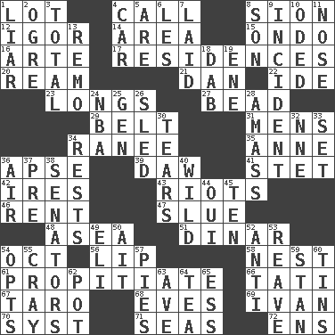ACROSS 1. Car dealer's back yard 4. Give a ring to 8. The Jewish people; Israel 12. Russian composer Stravinsky 14. Length times width 15. Southwest Nigerian state 16. Johnson of "Laugh-In" 17. Dwellings 20. 480, 500 or 516 sheets of paper 21. One of the 12 tribes of Israel 22. Binary compound 23. Yearns 27. Necklace unit 29. Waist strap 31. Not women's 34. The wife of a rajah (variant) 35. Singer Murray 36. Domed church section 39. Obsolete 41. Proofreading order 42. Angers 43. Debaucheries 46. Monthly bill 47. Change direction abruptly 48. Toward the sea 51. Middle Eastern gold or silver currency 54. Sep. follower 56. Mouth edge 58. Egg locale 61. Appease 66. Jacques of French films 67. Edible starchy tuberous root 68. Nights before holidays 69. "Terrible" tsar 70. System (abbr.) 71. Oceans 72. Followers of ems DOWN 1. One who doesn't tell the truth 2. Legendary monster 3. Add up to 4. 4-wheeled motor vehicle 5. "We ___ not amused" (Victoria) 6. French article 7. Put down 8. Manchild 9. Event 10. Wrote a lyric poem 11. Characteristic smell of wine 13. San ____ (Riviera town) 18. Small moist lump or mass 19. Compass dir. 24. Basketball assoc. 25. Commissioned mil. rank 26. Downhill vehicle 28. Collect or gather 30. Separates forcefully 32. Compass dir. 33. Put into a specified state 34. Musical pauses 36. Wind 37. Before (prefix) 38. Elected representatives 40. Rampant 44. Fr. "Yes" 45. "___ Little Indians" 49. Connecticut Ivy Leaguer 50. Small island 52. Opposed to 53. Break or tear apart 54. Chooses 55. Supercomputer manufacturer 57. Sliced desserts 59. Comedian Laurel of Laurel & Hardy 60. Airtight sealed metal containers 62. Plant holder 63. "___ Maria" 64. Beverage made from leaves 65. Double-curved letter