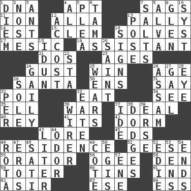 ACROSS 1. Heredity factor (abbr.) 4. Fitting 7. Droops 11. Electrically charged atom 12. Silent film actress Nazimova 13. Friendly 14. Eastern Standard Time (abbr.) 15. Clement's nick name 16. Finds the solution 17. Of or pertaining to a meson 19. Helper 21. Two (Sp.) 23. Eons 24. Abrupt rush of wind 25. Acquire through effort 26. Mature 29. Before Barbara or Clara 30. Followers of ems 31. Declare 32. Luau course 33. Consume 34. Observe 35. Pipe bend 36. Armed conflict 37. Standard of perfection 40. Marina Del _, California 41. It is 42. Dormintory (informal) 43. Old wives' tales, e.g. 45. Begley and Asner 46. Dwelling 51. Honkers 55. Speaker 56. Double curve, resembling the letter S 58. Lair 59. Carrier 60. Metal containers 61. Indiana (abbr.) 62. SW Saudi Arabia district 63. Compass dir. 64. Curvy letter DOWN 1. South Vietnam president (1954) 2. Characteristic smell of wine 3. Pismires 4. Everything 5. Entreaty 6. Scottish caps 7. Table seasonings 8. Inventor's middle name 9. Small, secluded valley 10. System (abbr.) 12. Buttonhole 13. Airs 16. Public displays of written messages 18. Goddess of spring and wife of Bragi 20. Inhabitant of Heaven 22. R.R. building 24. Lightheartedly 25. Puts on (as clothing) 26. Indian state 27. Highlander 28. Sight organ 29. Flatfish 32. For each 33. Ingested 36. One who wires 37. Binary compound 38. Evades 39. Celtic language 43. 61 cubic inches 44. Scent 46. Round or rotation of duties 47. Greek god of love 48. Suttee (variant) 49. ____ d'Azur (French Riviera) 50. The front part of a cuirass 52. Singer Brickell 53. Elected reps. 54. Extremities 57. Compass dir.