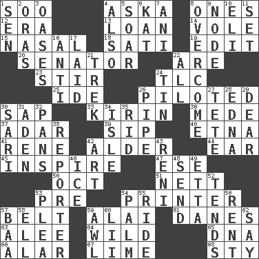 ACROSS 1. "Barney Miller" actor Jack 4. "____ silly question..." 8. Singles 12. Epoch 13. Grant temporary use of 14. Short-tailed, large-bodied rat 15. Rhinal 18. Suttee (variant) 19. Prepare for publication 20. Elected representative 22. "We ___ not amused" (Victoria) 23. Use a swizzle stick 24. Affectionate concern, for short 25. Binary compound 26. Manned the helm 30. Plant excrement 33. Japanese brewing company 36. Ancient Persian 37. The sixth month of the Jewish calendar 39. Small drink 40. Inactive volcano in Sicily 41. French philosopher Descartes 42. Tree or shrub in the Birch family 44. Ewer handle 45. Heighten or intensify 47. Compass dir. 50. Sep. follower 51. Remaining after all deductions 53. Before (prefix) 54. Hard copy producer 57. Waist strap 59. Jai ____ 61. Natives or inhabitants of Denmark 63. Toward shelter 64. Uncontrolled 65. Heredity factor (abbr.) 66. Having or resembling wings 67. Welles in "The Third Man" 68. Filthy place DOWN 1. Elected rep. 2. Mouths or openings 3. Fertile tracts in a desert 4. In addition 5. Fly high 6. Krazy ___ of comics 7. Cuckoo 8. Conquer 9. Connecting point 10. Biblical high priest 11. Arrange properly for use 16. Against 17. Put down 21. Long journey 22. Everything 24. Shallow baking pan 26. Corncob 27. Wig 28. Pulitzer Prize-winning author Ferber 29. Letter starter 30. Indian skirt 31. Arabian gulf 32. Zero-star reviews 34. Small island 35. To free from 38. Newsperson 42. Tate display 43. Painter Guido (1575-1642) 46. Frozen water 48. Transmit 49. Singer James 52. Watches over 53. Entreaty 54. Inside of hand 55. Travel on an animal 56. Monthly bill 57. Sound made by sheep 58. Pipe bend 59. Leather borer 60. Cards in a Roman deck? 62. Declare