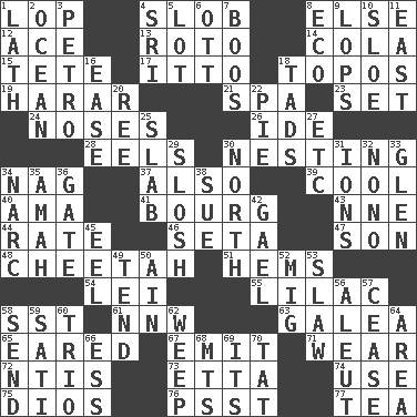 ACROSS 1. Trim (branches) 4. Messy guy 8. Otherwise 12. Adept person 13. Printing process, for short 14. Root beer relative 15. Wig 17. "Tell ____ the Marines!" 18. Literary convention 19. Ethiopian city, capital of Harari 21. Health resort 23. Put into a specified state 24. Olfactory organs 26. Binary compound 28. Snakelike fish 30. Nestling 34. Tired old horse 37. In addition 39. Calm and collected 40. Wet nurse (var.) 41. Town 43. Compass dir. 44. Pace 46. Bristle 47. Boy, to dad 48. Leopard's kin 51. Equivocates 54. Flowery wreath 55. Pale purple color 58. Fast jet (abbr.) 61. Compass dir. 63. An organ shaped like a helmet 65. Having ears or earlike features 67. Send forth 71. Put on (as clothing) 72. Nuclear Threat Initiatives 73. Singer James 74. Purpose 75. "Vaya con ____" 76. Inconspicuous attention getter 77. Beverage made from leaves DOWN 1. Thin strip of wood or metal 2. Sea 3. Stone: prefix 4. _ Lanka 5. Car dealer's back yard 6. Baseball player Mel 7. Expressions of contempt or scorn 8. Environmental prefix 9. Chops off 10. _ gin 11. Compass direction 16. Relaxation 18. Bits 20. Portuguese money of account (variant) 22. Sliced dessert 25. Broad, flat, thick piece 27. And so on (abbr.) 29. Splash clumsily 30. 0 degrees 31. Charged particles 32. Words to Nanette 33. Small, secluded valley 34. Drug cop 35. Wet nurse 36. Yard entry 38. Institute legal proceedings 42. Highlander 45. Snakelike fish 49. Watch over 50. The 18th letter of the Arabic alphabet 52. Russian fighter aircraft 53. Cole _ (cabbage dish) 56. Native American of Southwest Alaska 57. Stop 58. Transmit 59. Suttee (variant) 60. Musical group of three 62. Shed a tear 64. Type of rug 66. Double-curved letter 68. Mountains (abbr.) 69. It is 70. Make lace