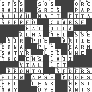 ACROSS 1. Global Positioning Systems (abbr.) 5. Distress signal 8. The grampus (Milton) 11. Water falling in drops from the sky 12. Indian titles of respect 14. Infant food 15. Assad's deity 17. Electrical Unit 18. Singer James 19. Oozed 21. Rough 23. Erode 25. Rounded earthenware pot or jar 26. _ mater 27. Cartoonist voice _ Blanc 28. Compass dir. 31. Title for a knight 33. Before (prefix) 35. Nick name for Arthur 37. Pulitzer Prize-winning author Ferber 38. Apply oneself diligently 40. Merit 41. Man with strong sexual desires 43. Area sheltered from the wind 45. Compass dir. 46. Ring climax 47. Followers of ems 50. 57 in ancient Rome 52. Small bottle 53. Allow 54. Right away 56. Spring feasts 61. Soared 62. Domed church section 65. Methods 66. Snakelike fish 67. Path through which fluid escapes 68. Behest 69. Fifth month 70. Color 71. Pismires DOWN 1. Pate de foie ____ 2. Light colored 3. Drop; flow; fall 4. Fastener 5. Compass dir. 6. Mouth or opening 7. "Cheers" or "Ellen" 8. Chooses 9. Pace 10. Tax preparer (abbr.) 13. Took without asking 16. The bottom of a shoe or boot 18. Period 20. Moist 22. Silent film actress Nazimova 24. Canvas cover 26. Like ___ of sunshine 28. Comedian Laurel of Laurel & Hardy 29. Beget 30. Car or cant ending 31. Neighbor of Neb. 32. To the inside or interior of 34. Pipe bend 36. Painter Guido (1575-1642) 37. Eastern Standard Time (abbr.) 39. Shout 42. It's straight from the horse's mouth 44. Nights before holidays 48. Brizilian seaport 49. Had an oblique or slanted direction 51. Detail 52. Promise 54. Entreaty 55. Have trust in 57. Capital of the state of Qatar 58. Locale of original sin 59. State of inaction 60. Fast planes 61. Opposite of masc. 63. Declare 64. Make supply last