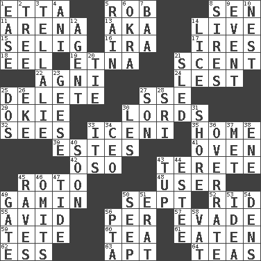 ACROSS 1. Singer James 5. Director Reiner 8. Elected rep. 11. Sports stadium 13. Alias (abbr.) 14. Moving, as bait 15. Major League Baseball Commissioner Bud 16. Retirement account (abbr.) 17. Angers 18. Snakelike fish 19. Inactive volcano in Sicily 21. Odor 22. Hindu god of fire 24. For fear that 25. Keyboard key 27. Compass dir. 29. Migrant worker of the '30s 30. Titled peers of a realm 32. Observes 33. Ancient Celtic tribe of eastern Britain 35. Dwelling 39. _____ Park, CO 41. Baking chamber 42. Bear (Spanish) 43. Cigar-shaped 45. Printing process, for short 48. One who makes use of a thing 49. Street urchin 50. Back-to-school mo. 52. To free from 55. Enthusiastic 56. For each 57. Elude 59. Wig 60. Afternoon social gathering 61. Eroded 62. Curvy letter 63. Fitting 64. Afternoon social gatherings DOWN 1. Relaxation 2. Relationship diagram 3. Copy Pinocchio 4. Black tropical American cuckoo 5. Water falling in drops from the sky 6. Gumbo ingredient 7. Sound made by sheep 8. Titles for men of rank and authority 9. Happening 10. A home for chicks 12. Rep 14. Louse (plural) 20. Standoff 21. Downhill vehicle 23. Honkers 25. Two (Sp.) 26. Make supply last 27. Manchild 28. Indian title of respect (Mr.) 30. French article 31. Dinah or Pauly 33. ___ a Wonderful Life 34. Corporate head (abbr.) 36. Make much ado about nothing 37. Was introduced to 38. Compass dir. 40. Within a short period 43. Uncastrated adult male sheep 44. First name in cosmetics 45. All-night dance parties 46. Leaves out 47. Event that recurs at intervals 49. Yard entry 50. Ooze 51. Part of Q.E.F. 53. It may be bright or harebrained 54. Cub Scout units 56. Parent Teacher Association (abbr.) 58. Large container