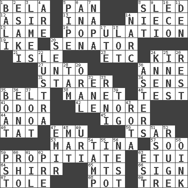 ACROSS 1. Actor Lugosi 5. Baking dish 8. Downhill vehicle 12. SW Saudi Arabia district 13. _ tizzy (2 wds.) 14. Sibling's daughter 15. Unable to walk 16. Census information 19. Mamie's mate 20. Legislator 21. Small island 23. And so on (abbr.) 24. Apertif with cassis 27. To (old English) 30. Singer Murray 31. A viewer who gazes fixedly 34. Elected reps. 35. Waist strap 38. French painter Edouard 40. Trial 41. Scent 42. Poe poem 44. Small Philippine buffalo 45. Russian composer Stravinsky 46. Make lace 47. Australian flightless bird 50. Russian ruler of old 53. Chrissie's court nemesis 57. "Barney Miller" actor Jack 59. Conciliate 63. Needle holder 64. Bake eggs in their shells 65. Mountains (abbr.) 66. Attach a signature 67. Lacquered or enameled metalware 68. Cooking vessel 69. Long journey DOWN 1. Indonesian resort city 2. 1973 Nobel Price Winner (Physics) Leo 3. Citrus fruits 4. "We ___ not amused" (Victoria) 5. Corncob 6. At once, immediately (arch.) 7. California wine valley 8. Be seated 9. Flowery wreath 10. Environmental prefix 11. Lair 14. Drug cop 17. Shoshoni 18. Car dealer's back yard 20. Transmitted 22. A period of five years 24. Leg joint 25. Restaurants 26. Take ten 28. Scottish cap 29. Spoken 30. Michaelmas daisies 32. Compass dir. 33. Painter Guido (1575-1642) 35. Water vessel 36. Pulitzer Prize-winning author Ferber 37. Plunder 39. Coat; cloak 43. Roll call or roster of names 47. Independent ruler or chieftain 48. Floor protector 49. RI univ. 51. Moving about 52. Makeup applied to the cheeks 54. Pack (down) 55. "Tell ____ the Marines!" 56. Egg locale 58. Pig sound 59. Pacific Standard Time (abbr.) 60. 17th letter of the Greek alphabet 61. Lubricate 62. Before (prefix) 63. Eastern Standard Time (abbr.)