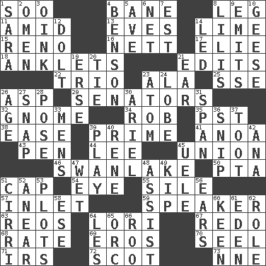 ACROSS 1. "Barney Miller" actor Jack 4. Object of repulsion 8. Part of a journey 11. Among 13. Nights before holidays 14. Welles in "The Third Man" 15. Western Nevada city 16. Remaining after all deductions 17. Writer Wiesel 18. Short socks 21. Prepares for publication 22. Musical group of three 23. According to 25. Compass dir. 26. Cleo's killer 29. Legislators 32. Dwarf 34. Director Reiner 35. Pacific Standard Time (abbr.) 38. Comfort 39. A-one 41. Small Philippine buffalo 43. Writing instrument 44. Area sheltered from the wind 45. The state of being joined or united 46. Tchaikovsky ballet 50. Parent Teacher Assoc. 51. Head covering 54. Sight organ 55. Filth; sediment 57. An arm off of a larger body of water 59. Orator 63. Vintage cars 64. Australian parrot (variant) 67. Redecorate 68. Assign a rank or rating to 69. Greek god of love 70. Stitch closed the eyes of (a falcon) 71. Big collection agency 72. Native of Scotland 73. Compass dir. DOWN 1. "Two Mules for Sister ____" 2. Sign of things to come 3. Pig sound 4. Gillaume's butler role 5. "___ Maria" 6. Fish or hair follower 7. Eastern Standard Time (abbr.) 8. Ms. Damita and namesakes 9. Sends forth 10. Honkers 12. Dunce 14. Directed 19. Celtic language 20. Make a knot 21. Ewer handle 23. Smallest unit of an element 24. Ear part 26. Ripen 27. Fastener 28. Introduce or present, as a question 30. Satellite of Uranus 31. Connect, as a bridge 33. Not women's 36. Clip 37. A blast of a horn 39. Frolic 40. French philosopher Descartes 42. Santa ___, CA 45. Ubangi River tributary 47. Dripping 48. Aid 49. Sleep 51. High-altitude cloud 52. Approach 53. Small pieces of grounds 56. Hearing organs 58. Compass dir. 60. Peachy ____! 61. Paradise 62. Hero or heavy, e.g. 64. French article 65. The grampus (Milton) 66. Friend of Pooh