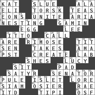 ACROSS 1. Krazy ___ of comics 4. Change direction abruptly 8. In the manner of 11. Biblical high priest 12. Cod relative 14. Afternoon social gatherings 15. Immeasurably long periods of time 17. Join together 18. Roberta Peters solo 19. Snuggling 21. Street urchin 23. Oval reproductive body of a fowl 24. Area sheltered from the wind 25. "Tell ____ the Marines!" 27. Give a ring to 30. "We ___ not amused" (Victoria) 31. Full of chinks, cracks, or crevices 34. Teat (slang) 37. Elected rep. 38. Receives possession of 39. Wet nurse (var.) 40. Pacific Standard Time (abbr.) 41. Make 43. Experiment locale 44. "______ My Girl" (Turtles hit) 45. "I Love _" 47. Be seated 49. Groovy apt. 50. Letch 52. Elected representative 56. Whine 57. Small island 60. Old wives' tales, e.g. 61. Thailand, formerly 62. Flexible twig of a willow tree 63. Actress Charlotte 64. It would 65. Native american tent (variation) 66. Order of Saint Francis (abbr.) DOWN 1. Peachy ____! 2. _ vera 3. Metal containers 4. Feeling sharp psychological pain 5. Having great length 6. RI univ. 7. Eastern Standard Time (abbr.) 8. Nest on high 9. (Had) reclined 10. White ___ sheet 13. Barrel 14. Docile 16. Proofreading order 20. Composer Stravinsky 22. 100% 25. Angers 26. Portable shelter 27. Popular sodas 28. Toward the sea 29. For fear that 30. Viper 32. Hankering 33. Female horse 34. Baby powder 35. "If ____ say so..." 36. Keyboard key 42. Liveliness 44. Filthy place 46. Freehold land 47. First course 48. A distinct part 49. _ dish (used to culture cells) 50. Set of matching outer garments 51. River (Sp.) 52. Ooze 53. "Corrida" creature 54. Mouths or openings 55. Coral ridge 56. 23rd letter of the Greek alphabet 58. Fast jet (abbr.) 59. Cards in a Roman deck?