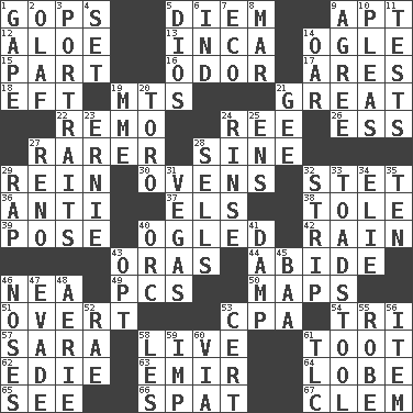 ACROSS 1. Republicans 5. South Vietnam president (1954) 9. Fitting 12. Medicinal plant 13. South American Indian 14. Stare at amorously 15. Component 16. Scent 17. Ancient Greek god of war 18. Newt 19. Mountains (abbr.) 21. Relatively large 22. San ____ (Riviera town) 24. To sift 26. Double-curved letter 27. More valued for its uncommonness 28. Trig term 29. It's straight from the horse's mouth 30. Baking chambers 32. Proofreading order 36. Opposed to 37. Raised railways 38. Lacquered or enameled metalware 39. Airs 40. Stared 42. Precipitation 43. Mouths or openings 44. Remain 46. Teachers' org. 49. Personal Computers (abbr.) 50. Atlas contents 51. Unconcealed 53. Tax preparer (abbr.) 54. Three (prefix) 57. "Two Mules for Sister ____" 58. Not recorded 61. A blast of a horn 62. Singer Brickell 63. Arab leader 64. Ear part 65. Observe 66. Argument over a trivial matter 67. To starve (Brit.) DOWN 1. Open wide 2. Norwegian king 3. Likenesses of persons 4. Arrange properly for use 5. "Vaya con ____" 6. Indiana (abbr.) 7. Environmental prefix 8. Spoil 9. Match 10. Entreaties 11. Trials 14. Rowing implement 19. Madame (abbr.) 20. "Corrida" creature 21. Turn to the right 23. Bert's buddy 24. Remove soap 25. Followers of ems 27. Western Nevada city 28. Exchanges for money 29. Strike 31. Viva Las _ 32. Long narrow piece of something 33. Inedible or poisonous agaric 34. Writer Wiesel 35. "___ Little Indians" 40. The grampus (Milton) 41. Moist 43. Choose 45. Sound made by sheep 46. Olfactory organs 47. Dodge 48. Nest on high 52. Actress Charlotte 53. Sure thing 55. Loose flowing garment 56. A distinct part 58. French article 59. Naughty child 60. By way of 61. Affectionate concern, for short