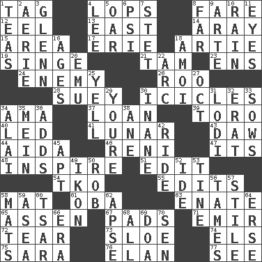 ACROSS 1. Label 4. Chops off 8. Conductor's collection 12. Snakelike fish 13. Compass direction 14. Like ___ of sunshine 15. Type of rug 17. 4th largest of the Great Lakes 18. Nick name for Arthur 19. Scorch 21. Scottish cap 23. Followers of ems 24. Foe 26. Friend of Pooh 28. Chop _ 30. Winter's stalactites 34. Housemaid (var.) 37. Grant temporary use of 39. "Corrida" creature 40. Directed 41. Type of eclipse 43. Fool 44. Opera by Verdi 46. Painter Guido (1575-1642) 47. It is 48. Heighten or intensify 51. Prepare for publication 54. Ring climax 55. Proofreads 58. Floor protector 61. Chief or king in Benin or Nigeria 63. Related on the mother's side 65. NE Netherlands city 67. Writing tablets 71. Independent ruler or chieftain 72. Rend 73. _ gin 74. Raised railways 75. "Two Mules for Sister ____" 76. Flair 77. Observe DOWN 1. Beverages made from leaves 2. Nest on high 3. American astronaut and politician John 4. Area sheltered from the wind 5. Boat paddle 6. 23rd letter of the Greek alphabet 7. Proofreading order 8. Distant 9. Johnson of "Laugh-In" 10. Water falling in drops from the sky 11. Sight organs 16. Eons 18. Mine, in Marseilles 20. Australian flightless bird 22. Curve 25. Shout 27. Sep. follower 29. You are 30. Empty; void 31. Farming town in central California 32. Part of Q.E.F. 33. Sty mamas 34. Jai _ 35. Chow _ 36. Sums up 38. A saturated hydrocarbon 42. Travel on or in a vehicle 45. Fitting 49. Picture 50. Director Reiner 52. Binary compound 53. Prong on a fork 56. Softens 57. Vertical member of a panel or frame 58. Floor protectors 59. At sea 60. Russian ruler of old 62. Domed church section 64. Celtic language 66. Period 68. Everything 69. ___ good deed 70. Elected rep.