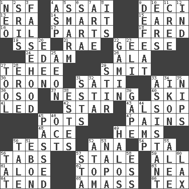 ACROSS 1. Overdraft (abbr.) 4. Slender Brazilian palm 9. Tenth: prefix 13. Epoch 14. Don Adams' spy role 15. Merit 16. Lubricate 17. Actors' quests 18. Flintstone 19. Compass dir. 21. Actress Charlotte 22. Honkers 24. Dutch treat 26. Insect wing 27. Giggle 29. Stricken, poetically 30. U. of Maine site 31. Suttee (variant) 33. The 18th letter of the Arabic alphabet 36. Bear (Spanish) 37. Nestling 40. What Jean-Claude Killy likes to do 41. Directed 42. Play the lead 43. Columnist Joseph or Stewart 45. Plant holders 47. Aches 48. Adept person 49. Equivocates 50. Trials 52. Santa ___, CA 54. Parent Teacher Association (abbr.) 56. Bar bills 57. Showing deterioration from age 59. Everything 61. _ vera 62. Traditional theme or motif 63. Teachers' org. 64. Be inclined (to) 65. Collect or gather 66. John Ritter's dad DOWN 1. Modern: prefix 2. Indian titles of respect 3. It jiggles the polygraph 4. Viper 5. Excessive but superficial compliments 6. "Two Mules for Sister ____" 7. Johnson of "Laugh-In" 8. ___ a Wonderful Life 9. Outscore 10. Hearing organs 11. Algonquian 12. Indiana (abbr.) 20. Genesis locale 22. Homeless child 23. Connecticut Ivy Leaguer 25. Period of immesurable duration 27. Implement 28. Celtic language 29. Move through with a circular motion 31. Fast planes 32. "One Day ___ Time" 33. Aide 34. Picture 35. Cuts off 38. _____ Park, CO 39. Open wide 44. Desk light 45. Went by 46. Sep. follower 49. Radiant circles of light 50. Falsehood 51. Inky black, to poets 52. Smallest unit of an element 53. California wine valley 55. Toward shelter 56. Make lace 57. R.R. building 58. Double-curved letter 60. Not strict
