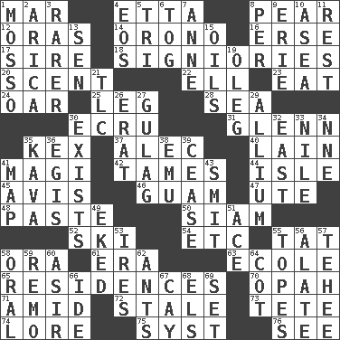 ACROSS 1. Impair 4. Singer James 8. Lightbulb-shaped fruit 12. Mouths or openings 14. U. of Maine site 16. Celtic language 17. Male parent of an animal 18. Seigniories (variant) 20. Odor 22. Pipe bend 23. Consume 24. Rowing implement 25. Part of a journey 28. Ocean 30. Shade of tan 31. American astronaut and politician John 35. Dry husk or covering 37. Actor Baldwin 40. (Had) reclined 41. Wise men 42. Makes less strong or intense 44. Small island 45. Deliberation 46. Island territory of the United States 47. Shoshoni 48. Thick mixture 50. Thailand, formerly 52. What Jean-Claude Killy likes to do 54. And so on (abbr.) 55. Make lace 58. Mouth or opening 61. Period 63. Learning spot: Fr. 65. Homes 70. Brightly colored fish 71. Among 72. Having lost freshness 73. False hair 74. Old wives' tales, e.g. 75. System (abbr.) 76. Perceive with the eye DOWN 1. With motion or animation 2. N. Chile seaport 3. Less widely known 4. Greek goddess of the dawn 5. Three (prefix) 6. Coat; cloak 7. Queen of England 1702-14 8. For each 9. One of the Great Lakes 10. Toward the sea 11. State of inaction 13. Elected rep. 15. Petroleums 19. Cassini of fashion 21. Affectionate concern, for short 26. Part of Q.E.F. 27. POW camp 29. Plant genus of onion and garlic 30. Is 32. Compass direction 33. Mediterranean tributary 34. Compass dir. 35. Polynesian shrub of the pepper family 36. Armor plate that protects the chest 38. Australian flightless bird 39. Stop 41. Atlas unit 43. Stricken, poetically 49. Made supply last 51. Adept person 53. Angers 55. Drinks excessively 56. Having winglike extensions 57. Giggle 58. Spoken 59. San ____ (Riviera town) 60. SW Saudi Arabia district 62. Pismires 64. Small bed 66. Binary compound 67. Island 68. Raised railways 69. Arrange properly for use