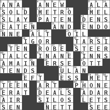 ACROSS 1. Santa ___, CA 4. Afresh 8. In the manner of 11. Disposed of to a purchaser 13. Paris' subway 15. Cartoonist voice _ Blanc 16. Kill 17. Eucharist need 18. Hiding places for outlaws 19. Eroded 21. Also 22. Inside; within (prefix) 23. Compass dir. 24. The first octave above the treble staff 27. Petroleum 29. Russian composer Stravinsky 30. Tarsus (plural) 34. "___ Little Indians" 36. Loose flowing garment 39. Navigate 40. Baby powder 41. Silly 43. Taverns 44. With great haste 46. Celtic language 47. Baseball player Mel 48. Watches over 49. ____ Bator, Mongolia 51. Bank Draft (abbr.) 53. Curvy letter 54. Was introduced to 57. Adolescent 60. Nonscientific branch of learning 63. Give a jingle 65. Part of Q.E.F. 66. Allots cards 69. The sixth month of the Jewish calendar 70. Atmosphere 71. Grain storage towers 72. Allows 73. Elected rep. 74. Remaining after all deductions 75. Perceive with the eye DOWN 1. NE Netherlands city 2. Pitcher Ryan 3. Having winglike extensions 4. Electrical Unit 5. Teachers' org. 6. Singer James 7. Songbird 8. So be it 9. Grant temporary use of 10. In addition 12. Color 14. Southwest Nigerian state 18. Conveyance 20. Tired old horse 25. Australian parrot (variant) 26. Marketplace scale 28. ___ a Wonderful Life 29. Event 31. Monthly bill 32. Emitted 33. Big collection agency 34. Not wild 35. Style 37. Drinking establishment 38. Take place subsequently 40. Make lace 42. Snakelike fish 45. Overdraft (abbr.) 50. Cleo's killer 52. Small boys 54. Methods 55. Maternal 56. Laconic 57. Afternoon social gatherings 58. 4th largest of the Great Lakes 59. Merit 61. It's straight from the horse's mouth 62. Falsehood 64. Actor Linden 67. Car dealer's back yard 68. Fast jet (abbr.)