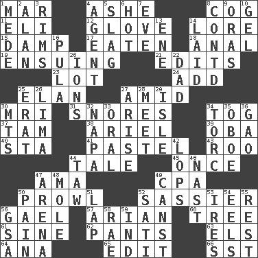 ACROSS 1. Third mo. 4. American tennis player Robert 8. Gear tooth 11. Biblical high priest 12. Michael Jackson trademark 14. Old wives' tales, e.g. 15. Moist 17. Ingested 18. Of or related to the anus 19. Following as a consequence or result 21. Proofreads 23. Car dealer's back yard 24. Find the sum of 25. Enthusiasm 27. Among 30. Medical imaging device (abbr.) 31. Sounds asleep 34. Coat; cloak 37. Scottish cap 38. Satellite of Uranus 39. Chief or king in Benin or Nigeria 40. R.R. building 41. Soft color 43. Friend of Pooh 44. Lie 45. Single time 47. Nursemaid (var.) 49. Accounting whiz (abbr.) 50. Move like a hungry wolf 52. More impudent 56. Highlander 57. Believer in; advocate of (suffix) 60. Family _ (genealogy) 61. Trig term 62. Leg coverings 63. Raised railways 64. Santa ___, CA 65. Prepare for publication 66. Fast jet (abbr.) DOWN 1. Ancient Persian 2. ____ Jay Lerner 3. Basketball hoops 4. Rep 5. Volcanic refuse 6. Being at a high temperature 7. Night before a holiday 8. Continued (abbr.) 9. Mouths or openings 10. Set 13. Compass dir. 14. Put down 16. Monetary unit of Botswana 20. Charged atoms 22. June honoree 25. Part of Q.E.F. 26. Pale green bean 27. Ascend 28. Rendezvous 29. Small island 30. Mountains (abbr.) 32. California wine valley 33. Of the mouth 34. Torque (variant) 35. Mitch Miller's instrument 36. E Mali city 42. Chops off 44. The 23rd letter of the Hebrew alphabet 46. Political cartoonist Thomas 47. Sports stadium 48. Undercover agent 49. 2nd pers. sing. pres. of can (arch.) 50. Ache 51. Pet locale 52. Suttee (variant) 53. Angers 54. Snakelike fish 55. Remainder 56. Girls' org. (abbr.) 58. Actress Charlotte 59. Indiana (abbr.)