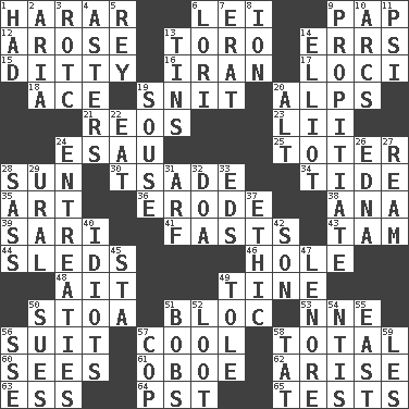 ACROSS 1. Ethiopian city, capital of Harari 6. Flowery wreath 9. Infant food 12. Came up 13. "Corrida" creature 14. Blunders 15. Simple song 16. SW Asia republic 17. Venues 18. Adept person 19. In a ____ (agitated or irritated) 20. High mountains 21. Vintage cars 23. Cards in a Roman deck? 24. Son of Isaac 25. Carrier 28. Player for Phoenix 30. Sadhe (variant) 34. Periodic rise and fall of the sea level 35. Nonscientific branch of learning 36. Wear away 38. Santa ___, CA 39. Indian skirt 41. Goes without food and/or water 43. Scottish cap 44. Bobsleighs 46. Opening into or through something 48. Small island 49. Prong on a fork 50. Portico 51. Coalition 53. Compass dir. 56. Costume for a special activity 57. Calm and collected 58. "_____ Recall" 60. Observes 61. Mitch Miller's instrument 62. Originate 63. Double-curved letter 64. Pacific Standard Time (abbr.) 65. Trials DOWN 1. Possessed 2. Roberta Peters solo 3. College mil. group 4. Michaelmas daisies 5. Marina Del _, California 6. Australian parrot (variant) 7. Part of Q.E.F. 8. Electrically charged atom 9. Conciliate 10. Arches 11. 23rd letter of the Greek alphabet 13. Canisters 14. American author Paul (1891-1958) 19. Lush 20. Keyboard modifier key 22. Erode 24. Pleas 26. Pulitzer Prize-winning author Ferber 27. 480, 500 or 516 sheets of paper 28. Backtalk 29. Mountain range 31. Sandy's bark 32. ___ good deed 33. Begley and Asner 37. Moral principle 40. Foolish or stupid persons 42. Boy, to dad 45. R.R. building 47. Poe poem 49. Lacquered or enameled metalware 50. Takes to court 51. Moves up and down 52. Plunder 54. Nuclear Threat Initiatives 55. Compass direction 56. Compass dir. 57. Police officer (slang) 58. Make lace 59. French article