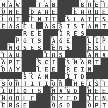 ACROSS 1. Opening into something insatiable 4. Bar bill 7. Cy Young winner Saberhagen 11. Single 12. Have the gumption 13. Wear away 14. Car dealer's back yard 15. Give off 16. Chalkboards 17. Artist's stand 19. Aide 21. To riddle 23. Angers 24. Cooking vessels 25. Grow older 26. Mouth edge 29. Olfactory organs 30. Followers of ems 31. Eastern Standard Time (abbr.) 32. The 19th letter of the Greek alphabet 33. Big collection agency 34. Santa ___, CA 35. Fitting 36. _-fi 37. Don Adams' spy role 40. 24 hours 41. Area sheltered from the wind 42. It's straight from the horse's mouth 43. Examine hastily 45. It would 46. Determination 51. Robbery 55. Foolish or stupid persons 56. Billionth: prefix 58. Born 59. Having high moral qualities 60. Colored 61. Nine, plus one 62. Celtic language 63. Bear (Spanish) 64. Elect DOWN 1. Undercover agent 2. Small Philippine buffalo 3. Soaks 4. Scottish cap 5. Operatic vocal solo 6. Wagers 7. Naughty children 8. Round or rotation of duties 9. Locale of original sin 10. Trial 12. Erase 13. Otherwise 16. Male parents of animals 18. Greek god of love 20. Attaches a signature 22. Double-curved letter 24. Inclined to pout 25. Nest on high 26. Acquire or gain knowledge or skills 27. Is not 28. Parent Teacher Association (abbr.) 29. California wine valley 32. Small amount or degree 33. Ancient Celtic tribe of eastern Britain 36. Narrow boards 37. _ Lanka 38. Mode 39. Helper 43. Fur scarf 44. Quote 46. Trig term 47. Aroma 48. Teases 49. Southwest Nigerian state 50. Negative votes 52. To the inside or interior of 53. Ooze 54. Portable shelter 57. Modern: prefix