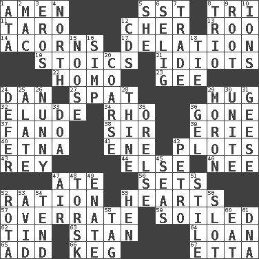 ACROSS 1. So be it 5. Fast jet (abbr.) 8. Three (prefix) 11. Edible starchy tuberous root 12. "Mermaids" star 13. Friend of Pooh 14. Oak nuts 17. Accusation by an informer 19. Unemotional ones 21. Foolish or stupid persons 22. Same (prefix) 23. Turn to the right 24. Daniel's nick name 27. Petty quarrel 29. Large cup 32. Dodge 34. 17th letter of the Greek alphabet 36. Went 37. Papal veil 38. Title for a knight 39. 4th largest of the Great Lakes 40. Inactive volcano in Sicily 41. Compass dir. 42. Schemes 43. Marina Del _, California 44. Otherwise 46. Born 47. Had dinner 50. Puts into a specified state 52. Food allowance for one day 55. Centers 57. Make much ado about nothing 59. Dirtied 62. Metal container 63. Comedian Laurel of Laurel & Hardy 64. Grant temporary use of 65. Find the sum of 66. Cask 67. Singer James DOWN 1. "One Day ___ Time" 2. Apple computer (short form) 3. Greek god of love 4. Compass direction 5. A female animal or person 6. Former Milwaukee Brewers owner Bud 7. Barter 8. Musical group of three 9. Carrot, for example 10. Charged atoms 12. Music discs 15. Trap for birds or small mammals 16. Simple or foolish person 18. Make a knot 20. Unrefined 24. Postpone 25. Having winglike extensions 26. Pet term 28. One or ones belonging to thee 29. Person of subnormal intelligence 30. Join together 31. Honkers 33. ___ good deed 35. Threatening words 36. Set 42. Stone: prefix 45. Oceans 47. Atmosphere 48. Cod relative 49. Related on the mother's side 51. Vertical member of a panel or frame 52. Roll call or roster of names 53. Enthusiastic 54. Watch over 55. Layer 56. Slit 58. Label 60. Consume 61. Heredity factor (abbr.)
