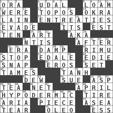 ACROSS 1. Mouth or opening 4. Hereditary estate 8. Rich soil 12. We are 14. Literary convention 16. Gumbo ingredient 17. (Had) reclined 18. Pleas 20. Elude 22. ___ a Wonderful Life 23. Eastern Standard Time (abbr.) 24. Nine, plus one 25. Nonscientific branch of learning 28. Alias (abbr.) 30. Nuclear Threat Initiatives 31. Following 35. Period 37. Moist 40. Tall New Zealand timber tree 41. Close up, plug up 42. Peak District village in England 44. Singer Brickell 45. Fastener 46. Greek god of love 47. Put into a specified state 48. Softens 50. Hyperbolic tangent 52. Morning condensation 54. Take to court 55. Cleo's killer 58. Beverage made from leaves 61. Fish or hair follower 63. Showery time 65. Subcutaneous 70. Become fatigued 71. Operatic vocal solo 72. Component 73. At sea 74. Rend 75. Butter sub 76. Double-curved letter DOWN 1. A small or young owl 2. Break or tear apart 3. Believer in; advocate of (suffix) 4. Shoshoni 5. Spanish title 6. Fitting 7. Australian parrot (variant) 8. Car dealer's back yard 9. Migrant worker of the '30s 10. Ancient Greek god of war 11. Vertical spar for supporting sails 13. Conclusion 15. Bristle 19. "____ silly question..." 21. Ingest 26. Travel on or in a vehicle 27. Sadhe (variant) 29. Anew 30. Slept 32. Periodic rise and fall of the sea level 33. Send forth 34. Regret 35. Inactive volcano in Sicily 36. Wander 38. Make imperfect 39. Schemes 41. Fast jet (abbr.) 43. Son of Isaac 49. Transmit 51. Teachers' org. 53. Shed a tear 55. Get up 56. Male parents of animals 57. Entreaties 58. Not this but _ 59. Jane of fiction 60. Capital of Western Samoa 62. Musical group of three 64. Parent Teacher Association (abbr.) 66. Boat paddle 67. Cartoonist voice _ Blanc 68. Frozen water 69. Corporate head (abbr.)