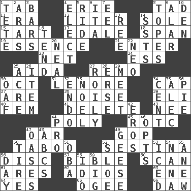ACROSS 1. Keyboard key 4. One of the Great Lakes 8. Small amount or degree 11. Epoch 12. 61 cubic inches 14. Not divided or shared with others 15. Small pie 17. Peak District village in England 18. Connect, as a bridge 19. Substance 21. Keyboard key 23. Fish or hair follower 24. Curvy letter 25. Opera by Verdi 27. San ____ (Riviera town) 30. Sep. follower 31. Poe poem 34. Head covering 37. "We ___ not amused" (Victoria) 38. Annoying sound 39. Biblical high priest 40. Opposite of masc. 41. Erase 43. Born 44. Many (prefix) 45. College mil. group 47. Boat paddle 49. Grand Old Party 50. Off limits 52. French poetic form 56. Flat circle 57. The Good Book 60. Examine minutely or intensely 61. Ancient Greek god of war 62. Goodbye (Sp.) 63. Compass dir. 64. It is so 65. Double curve, resembling the letter S 66. Obsolete DOWN 1. False hair 2. Ancient river in northeast Turkey 3. Oblong pieces of solid material 4. Opt 5. Travel on an animal 6. Call ___ day 7. Snakelike fish 8. Drinks excessively 9. Having or resembling wings 10. Lair 13. To separate or throw off 14. Fast planes 16. Watch over 20. Actress Patricia 22. Modern: prefix 25. 1/640 square mile 26. A whole individual unit 27. Agitated, as a liquid 28. Celtic language 29. Rendezvous 30. Clumsy lout 32. Inside; within (prefix) 33. Christmas carol 34. Penny 35. Actor Baldwin 36. Sliced dessert 42. Greek god of love 44. Adept person 46. Elects 47. Fertile tracts in a desert 48. Lettered men learn these first 49. Honkers 50. Hoop that covers a wheel 51. Chief or king in Benin or Nigeria 52. _ gin 53. On the rocks 54. Grandmother 55. Afresh 56. 24 hours 58. Wedding promise 59. Large