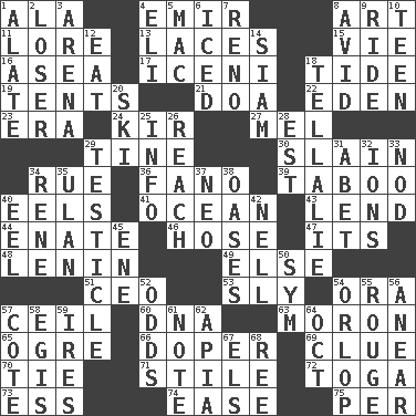 ACROSS 1. Wing 4. Independent ruler or chieftain 8. Tate display 11. Old wives' tales, e.g. 13. Shoestrings 15. Compete 16. At sea 17. Ancient Celtic tribe of eastern Britain 18. Periodic rise and fall of the sea level 19. Portable shelters 21. ___ good deed 22. Genesis locale 23. Epoch 24. Apertif with cassis 27. Cartoonist voice _ Blanc 29. Prong on a fork 30. Killed 34. Sorrow 36. Papal veil 39. Off limits 40. Snakelike fish 41. Sea 43. Grant temporary use of 44. Maternal 46. Stockings 47. ___ a Wonderful Life 48. Soviet premier 1918-24 49. Otherwise 51. Corporate head (abbr.) 53. Secret 54. Mouth or opening 57. To provide with a ceiling 60. Heredity factor (abbr.) 63. Person of subnormal intelligence 65. Legendary monster 66. Drug addict 69. A slight indication 70. Standoff 71. Vertical member of a panel or frame 72. Ancient Roman robe 73. Curvy letter 74. Comfort 75. For each DOWN 1. Having winglike extensions 2. Failure 3. Sports stadium 4. Biblical high priest 5. Apple computer (short form) 6. On the rocks 7. Western Nevada city 8. Enthusiastic 9. Travel on an animal 10. Adolescent 12. Erode 14. Thailand, formerly 18. Copy Pinocchio 20. What Jean-Claude Killy likes to do 25. A message received and understood 26. Arrive at 28. Eastern Standard Time (abbr.) 29. One of the two male reproductive glands 31. Collude with 32. Charged atoms 33. Dreamland 34. French philosopher Descartes 35. Uhlan (variant) 37. Modern: prefix 38. Fertile tracts in a desert 40. Snakelike fish 42. 1994 drama film starring Jodie Foster 45. Compass dir. 50. Symbol (abbr.) 52. Likelihood 54. Fourth or lowest deck 55. Makeup applied to the cheeks 56. Approach 57. ____ d'Azur (French Riviera) 58. Armor plate that protects the chest 59. Angers 61. Musical sound 62. Capital of Western Samoa 64. Sep. follower 67. Raised railways 68. To sift