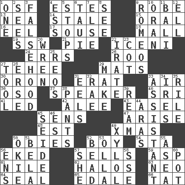 ACROSS 1. Order of Saint Francis (abbr.) 4. _____ Park, CO 9. Loose flowing garment 13. Teachers' org. 14. Showing deterioration from age 15. Spoken 16. Snakelike fish 17. Boozer 18. Promenade 19. Compass dir. 21. Sliced dessert 22. Ancient Celtic tribe of eastern Britain 24. Blunders 26. Friend of Pooh 27. Giggle 29. Floor protectors 30. U. of Maine site 31. Part of Q.E.F. 33. Wind 36. Bear (Spanish) 37. Orator 40. Indian title of respect (Mr.) 41. Directed 42. Toward shelter 43. Artist's stand 45. Elected reps. 47. Originate 48. Eastern Standard Time (abbr.) 49. Dec. holiday 50. Off-Broadway awards 52. Male child 54. R.R. building 56. Made supply last 57. Makes a sale 59. Cleo's killer 61. The longest river in the world 62. Radiant circles of light 63. Modern: prefix 64. Lick closed 65. Peak District village in England 66. Make lace DOWN 1. Single 2. Perceives with the eye 3. It jiggles the polygraph 4. Curvy letter 5. Discontinues 6. "Change" in Tahitian 7. Otherwise 8. Observe 9. Lover boys 10. NW Algerian seaport 11. Indonesian resort city 12. Pipe bend 20. Songbird 22. Feeling or showing extreme anger 23. Small bed 25. Vintage cars 27. Implement 28. Celtic language 29. Create 31. Snakelike fish 32. Actress Charlotte 33. Aide 34. Angers 35. Cause heat under the collar 38. Leg coverings 39. 480, 500 or 516 sheets of paper 44. Caspian sea tributary 45. A glass for beer 46. Compass dir. 49. Xylene (variant) 50. Migrant worker of the '30s 51. Actor Lugosi 52. Necklace unit 53. Spanish pot 55. At sea 56. Followers of ems 57. A female animal or person 58. Compass dir. 60. Cooking vessel
