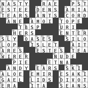 ACROSS 1. Offensive 6. Actress Charlotte 9. Pacific Standard Time (abbr.) 12. First name in cosmetics 13. Habitations of wild animals 14. Roberta Peters solo 15. Pulls apart 16. Pismires 17. Drawstring 18. One (Scot) 19. Mine, in Marseilles 20. Drink excessively 21. Cook's measure (abbr.) 23. RI univ. 24. Possessive pronoun 25. Keyboard key 28. Roguish 30. Fertile tracts in a desert 34. Grain storage tower 35. Trim (branches) 36. Small island 38. Small island 39. Ancient Greek god of war 41. _____ Park, CO 43. Beverage made from leaves 44. One who wires 46. Unadorned 48. Sliced dessert 49. Inactive volcano in Sicily 50. Actor Griffith 51. Hearing organs 53. What Jean-Claude Killy likes to do 56. _ vera 57. Arab leader 58. 1973 Nobel Price Winner (Physics) Leo 60. Highlander 61. Flaplike coverings 62. A piece of turf (Scot.) 63. Period 64. Call ___ day 65. Actors Connery and Penn DOWN 1. Fish or hair follower 2. Toward the sea 3. Comedian Laurel of Laurel & Hardy 4. Cylindrical with tapered ends 5. Affirmative reply 6. Former U.S. Attorney General Janet 7. Against 8. Curvy letter 9. Conciliate 10. Male parent of an animal 11. Small amount or degree 13. Moist 14. Oak nuts 19. Slender Brazilian palm 20. Third day of the wk. 22. Sis' sibling 24. Abnormally rapid or deep breathing 26. Writer Wiesel 27. Roll call or roster of names 28. Cole _ (cabbage dish) 29. Australian parrot (variant) 31. Compass dir. 32. Raised railways 33. Put into a specified state 37. Portable shelters 40. Beer mug 42. Player for Phoenix 45. Marina Del _, California 47. Small ungulate mammals of Africa 49. Blunders 50. Having or resembling wings 51. Send forth 52. Opera by Verdi 54. Polynesian shrub of the pepper family 55. Picture 56. Ripen 57. Biblical high priest 58. Begley and Asner 59. ___ a Wonderful Life