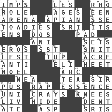 ACROSS 1. Naughty children 5. French article 8. 17th letter of the Greek alphabet 11. Hero or heavy, e.g. 12. Matures 14. Car or cant ending 15. Sports stadium 17. Bee-related 18. Compass dir. 19. Sycophants 21. Indian title of respect (Mr.) 22. ___ a Wonderful Life 23. Followers of ems 24. Two (Sp.) 25. Writing tablet 27. Cuckoo 28. Arranges properly for use 31. Greek god of love 35. Fast jet (abbr.) 37. In a ____ (agitated or irritated) 38. For fear that 39. Uncastrated adult male sheep 41. Measure of real estate 42. Opposed to 43. Biblical high priest 45. Confront 46. Christmas carol 47. Curve 49. Teachers' org. 51. Beverage made from leaves 52. Title for a knight 55. Purulenc 57. Reproach for some lapse or misdeed 60. Substance 62. Single; one (prefix) 63. Trading vessels 65. Leg joints 66. 54 in ancient Rome 67. Flintstone garb 68. Gouge 69. Had dinner 70. Cleo's killer 71. Indian titles of respect DOWN 1. Feeling or showing extreme anger 2. Person of subnormal intelligence 3. Entreaties 4. Post 5. Infant locale 6. The front part of a cuirass 7. Scorch 8. Home 9. Command 10. Washington bills 13. Sever or remove by pinching or nipping 16. Opera by Verdi 17. Help 20. Immeasurably long periods of time 26. Indian state 29. Hoop that covers a wheel 30. Proofreading order 31. Style 32. Western Nevada city 33. Clearly or manifestly demonstrative 34. Vertical member of a panel or frame 36. Third day of the wk. 40. Food holders 44. Angers 48. Keg 50. Bowlike part 52. Contemptuous expression 53. Ancient Celtic tribe of eastern Britain 54. Musical pauses 55. Monetary unit of Botswana 56. A single undivided whole 58. Operatic vocal solo 59. Groovy apts. 61. Conclusions 64. Slangy assent