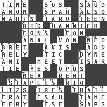 ACROSS 1. Prong on a fork 5. Distress signal 8. Saudi Arabian king (1953-1964) 12. At once, immediately (arch.) 13. Practice fight 15. In addition 16. Shops 18. Pacific island yam 19. Adolescent 20. To free from 22. More overdramatic by comparison 24. Immeasurably long periods of time 26. A really long time 27. Of or related to the anus 28. Solemn pledge 29. Modern: prefix 32. Cy Young winner Saberhagen 35. Opinion 37. Find the sum of 38. Depend 39. Nervous spasm 40. Unit of force 41. Cuckoo 42. Confront 43. Austrian river, tributary to the Danube 44. Neckwear 45. Affirmative reply 46. Musical composition 49. Teachers' org. 50. Monthly bill 51. Paper fasteners 55. _ de Janeiro 56. Belonging to Elizabeth 57. Angers 59. Get behind 63. Part of Q.E.F. 64. He sold his birthright 65. Docile 66. Suggestive of the supernatural 67. Compass dir. 68. Plant excrements DOWN 1. Scottish cap 2. _ tizzy (2 wds.) 3. Not either 4. Plea 5. Fast jet (abbr.) 6. Brightly colored fish 7. "Two Mules for Sister ____" 8. Smooth fabric 9. Toward shelter 10. One who uses or employs something 11. Spanish title 14. Lover boys 17. The Jewish people; Israel 21. Heredity factor (abbr.) 23. Cut the grass 25. Chalkboards 28. Winning man's name 29. Negative votes 30. Pulitzer Prize-winning author Ferber 31. River in Europe 32. Naughty child 33. Painter Guido (1575-1642) 34. Writer Wiesel 36. Compete 40. What propaganda does 42. Ear of corn 45. Slangy assent 47. For each 48. A single undivided whole 49. Offensive 51. Father 52. Czar 53. Celtic language 54. Oceans 56. Area sheltered from the wind 58. Institute legal proceedings 60. American Automobile Association (abbr.) 61. Naughty child 62. French article