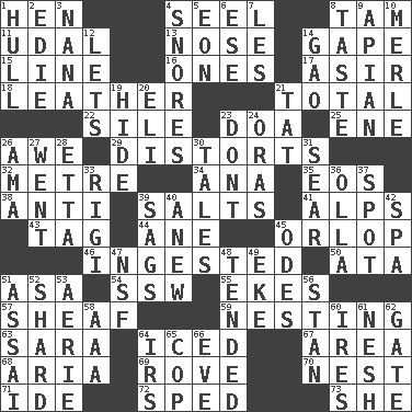 ACROSS 1. Layer 4. Stitch closed the eyes of (a falcon) 8. Scottish cap 11. Freehold land 13. Characteristic smell of wine 14. Yawn 15. Actor's bit 16. Singles 17. SW Saudi Arabia district 18. Cordwainer's material 21. Add up to 22. Filth; sediment 23. ___ good deed 25. Compass dir. 26. Deep reverence 29. What propaganda does 32. Distance measurement (Brit.) 34. Santa ___, CA 35. Greek goddess of the dawn 38. Opposed to 39. Table seasonings 41. High mountains 43. Label 44. One (Scot) 45. Fourth or lowest deck 46. Swallowed 50. _ moment's notice (2 wds.) 51. White ___ sheet 54. Compass dir. 55. Makes supply last 57. To gather and bind into a bundle 59. Inhabiting a nest 63. "Two Mules for Sister ____" 64. On the rocks 67. Length times width 68. Roberta Peters solo 69. Be footloose 70. Egg locale 71. Binary compound 72. Broke a traffic law 73. A female animal or person DOWN 1. Frame or body of a ship 2. Singer Brickell 3. Grandmother 4. Sounds asleep 5. Period of immesurable duration 6. Compass dir. 7. French article 8. Clothes sense 9. Bee-related 10. Haggard of country music 12. Allows 14. E Mali city 19. Flintstone garb 20. Biblical high priest 21. Make lace 23. Do not 24. Mouths or openings 26. Wet nurse (var.) 27. Left 28. Singer James 30. Lies 31. Shrivel 33. Swiss mountan, "Queen of the Mountains" 36. Rounded earthenware pot or jar 37. Blemish 39. Droops 40. Afresh 42. Health resort 45. Lyric poems 47. Science/research agcy. 48. Watched over 49. Supplement with great effort 51. Slender Brazilian palm 52. Pottery fragment 53. Nest on high 56. Comedian Laurel of Laurel & Hardy 58. Auto club (abbr.) 60. Angers 61. Soft 62. Yard entry 64. Big collection agency 65. Police officer (slang) 66. First lady