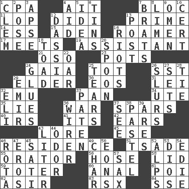 ACROSS 1. Tax preparer (abbr.) 4. Small island 7. Coalition 11. Chop off 12. "You Light Up My Life" star Conn 13. A-one 14. Double-curved letter 15. An important port of Yemen 16. Wanderer 17. Confronts 19. Aide 21. Bear (Spanish) 23. Plant holders 24. Greek goddess of the earth (variant) 25. Small child 26. Fast jet (abbr.) 29. A person who is older than you are 30. Greek goddess of the dawn 31. Flowery wreath 32. Australian flightless bird 33. Baking dish 34. Shoshoni 35. Untruth 36. Armed conflict 37. Practice fights 40. Big collection agency 41. It is 42. Hearing organs 43. Old wives' tales, e.g. 45. Compass dir. 46. Dwelling 51. Sadhe (variant) 55. Speaker 56. Stockings 58. Hat (slang) 59. Carrier 60. Of or related to the anus 61. Luau course 62. SW Saudi Arabia district 63. Acura sports coupe 64. Compass dir. DOWN 1. Clement's nick name 2. Introduce or present, as a question 3. Domed church section 4. Assist 5. It may be bright or harebrained 6. Airtight sealed metal containers 7. Naughty children 8. Pale green bean 9. Presage 10. Certainty 12. Small ungulate mammals of Africa 13. Mail 16. Disturbances 18. Frog relative 20. Soup utensil 22. Rowing implement 24. Adhesives 25. Rends 26. Runs notes together 27. Arranges properly for use 28. Neckwear 29. Independent ruler or chieftain 32. Connecticut Ivy Leaguer 33. Eucharist need 36. One who wires 37. Observe 38. Soft color 39. Ancient Greek god of war 43. 61 cubic inches 44. Aroma 46. Round or rotation of duties 47. Greek god of love 48. Suttee (variant) 49. Burn to charcoal 50. Immeasurably long periods of time 52. High mountains 53. "Vaya con ____" 54. Singer Brickell 57. Saxophone
