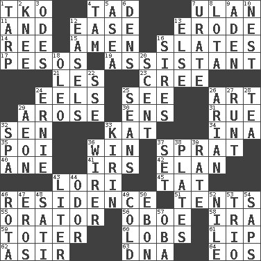 ACROSS 1. Ring climax 4. Small amount or degree 7. ____ Bator, Mongolia 11. Added to 12. Relaxation 13. Wear away 14. To sift 15. So be it 16. Chalkboards 17. Mexican monetary units 19. Helper 21. French article 23. Algonquian 24. Snakelike fish 25. Observe 26. Nonscientific branch of learning 29. Came up 30. Followers of ems 31. Sorrow 32. Elected rep. 33. Krazy ___ of comics 34. _ tizzy (2 wds.) 35. Luau course 36. Victory 37. Small fatty European fish 40. One (Scot) 41. Big collection agency 42. Liveliness 43. Australian parrot (variant) 45. Make lace 46. Home 51. Portable shelters 55. Speaker 56. Mitch Miller's instrument 58. Lyricist Gershwin 59. Carrier 60. Tennis shots 61. Mouth edge 62. SW Saudi Arabia district 63. Heredity factor (abbr.) 64. Greek goddess of the dawn DOWN 1. Canvas cover 2. Leg joint 3. Lyric poems 4. Scottish cap 5. Toward the sea 6. Lairs 7. A salt of uric acid 8. Globular water bottle used in Asia 9. Arabian gulf 10. Egg locale 12. Artist's stands 13. Otherwise 16. Titles for men of rank and authority 18. Margarine 20. Aroma 22. Compass dir. 24. Bert's buddy 25. Actors Connery and Penn 26. Believer in; advocate of (suffix) 27. The smallest animal of a litter 28. Beverage made from leaves 29. A really long time 32. Health resort 33. Japanese brewing company 36. One who wires 37. Put into a specified state 38. Food holders 39. Pace 43. 61 cubic inches 44. Scent 46. Roll call or roster of names 47. Greek god of love 48. Suttee (variant) 49. Chilled 50. Inky black, to poets 52. Mediterranean tributary 53. Musical group of three 54. Plant excrements 57. Chief or king in Benin or Nigeria