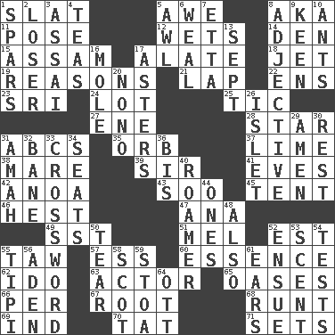 ACROSS 1. Narrow board 5. Deep reverence 8. Alias (abbr.) 11. Airs 12. Moistens 14. Lair 15. Indian state 17. Having winglike extensions 18. _ stream 19. Thinks logically 21. Infant locale 22. Followers of ems 23. Indian title of respect (Mr.) 24. Car dealer's back yard 25. Nervous spasm 27. Compass dir. 28. Play the lead 31. Lettered men learn these first 35. Globe 37. Welles in "The Third Man" 38. Female horse 39. Title for a knight 41. Nights before holidays 42. Small Philippine buffalo 43. "Barney Miller" actor Jack 45. Portable shelter 46. Command 47. Santa ___, CA 49. Fast jet (abbr.) 51. Cartoonist voice _ Blanc 52. Eastern Standard Time (abbr.) 55. The 23rd letter of the Hebrew alphabet 57. Curvy letter 60. Center 62. Wedding promise 63. Thespian 65. Fertile tracts in a desert 66. For each 67. Carrot, for example 68. Undersized animal 69. Working for oneself (abbr.) 70. Make lace 71. Puts into a specified state DOWN 1. Practice fights 2. Failure 3. Slender Brazilian palm 4. Afternoon social gatherings 5. Leather borer 6. Welt 7. Singer James 8. Descriptive word 9. Peachy ____! 10. Pismires 13. Back-to-school mo. 16. Undercover agent 17. Michaelmas daisies 20. Words to Nanette 26. Small island 29. So be it 30. Repose 31. Wet nurse 32. Object of repulsion 33. What you're doing now 34. Theater features 36. Twice 40. Nomad 44. Singles 48. In addition 50. Pull into pieces 52. Take place subsequently 53. Odor 54. Trials 55. Native american tent (variation) 56. Arabian gulf 58. Native of Scotland 59. Portico 61. Hearing organs 64. Baseball player Mel